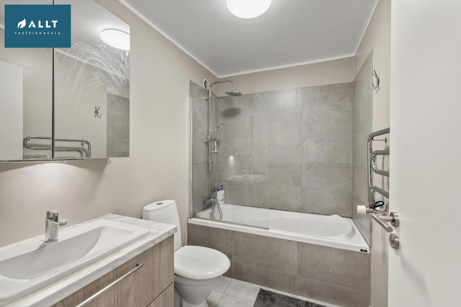 Baðherbergi: Baðkar með sturtu. Innrétting með handlaug og handklæðaofn. Gólfið og baðkar er flísalagt með gráum flísum.