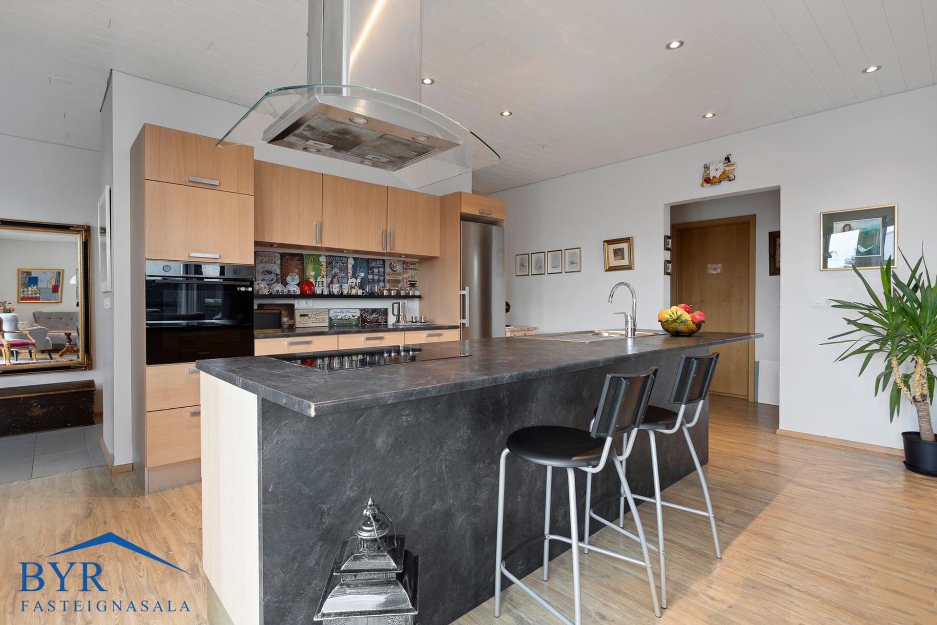 Eldhús, innrétting og eyja, spanhelluborð, háfur, Samsung ofn í vinnuhæð, ísskápur og beko uppþvottavél fylgir.