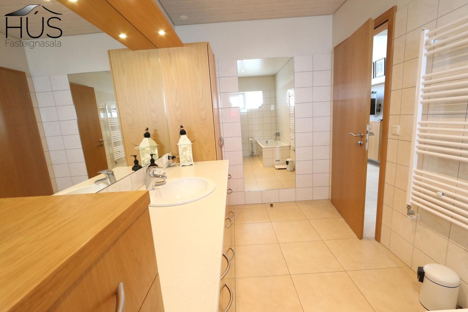 Baðherbergi með baðkari, innréttingu, handklæðaofni, flísalagt í hólf og gólf.