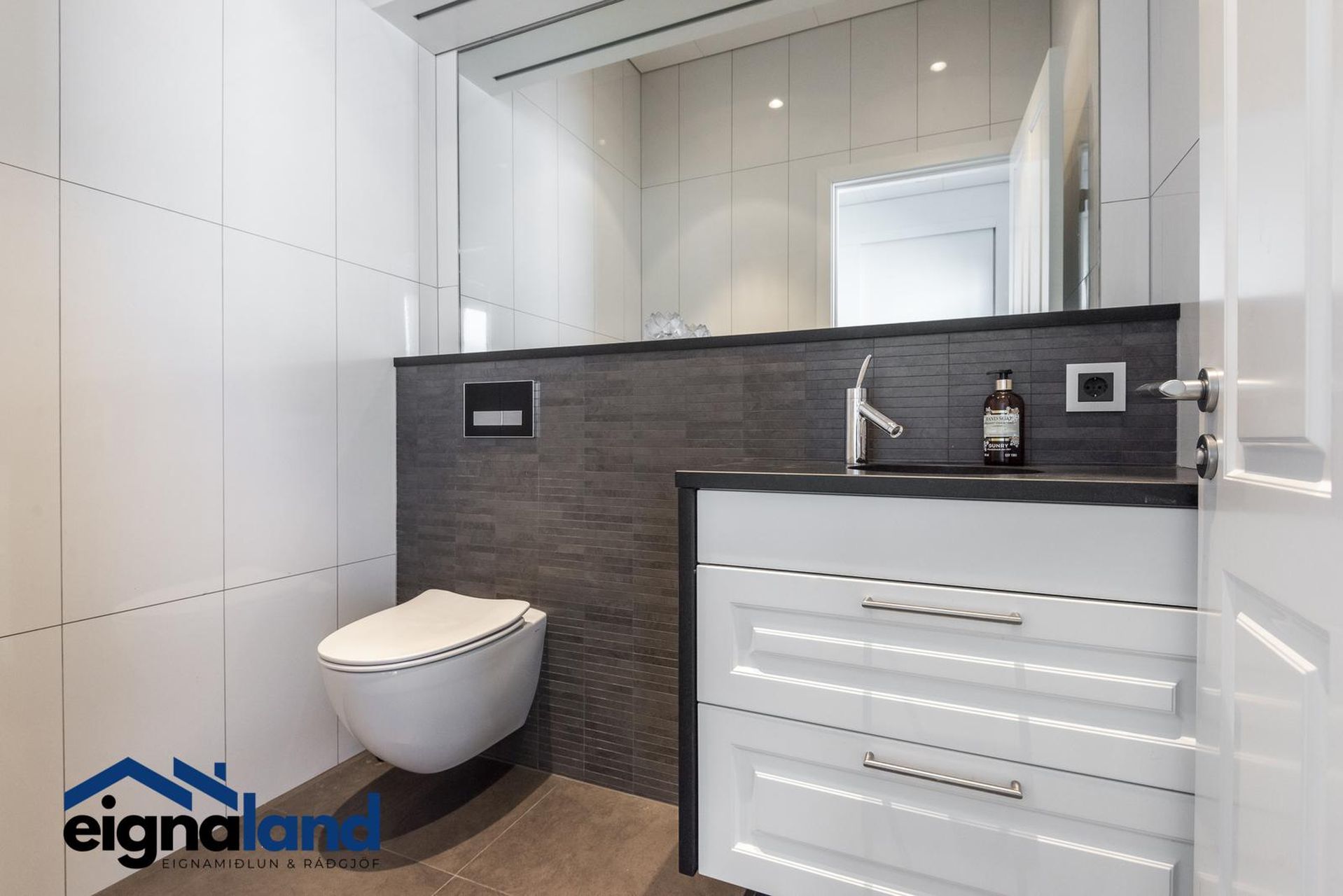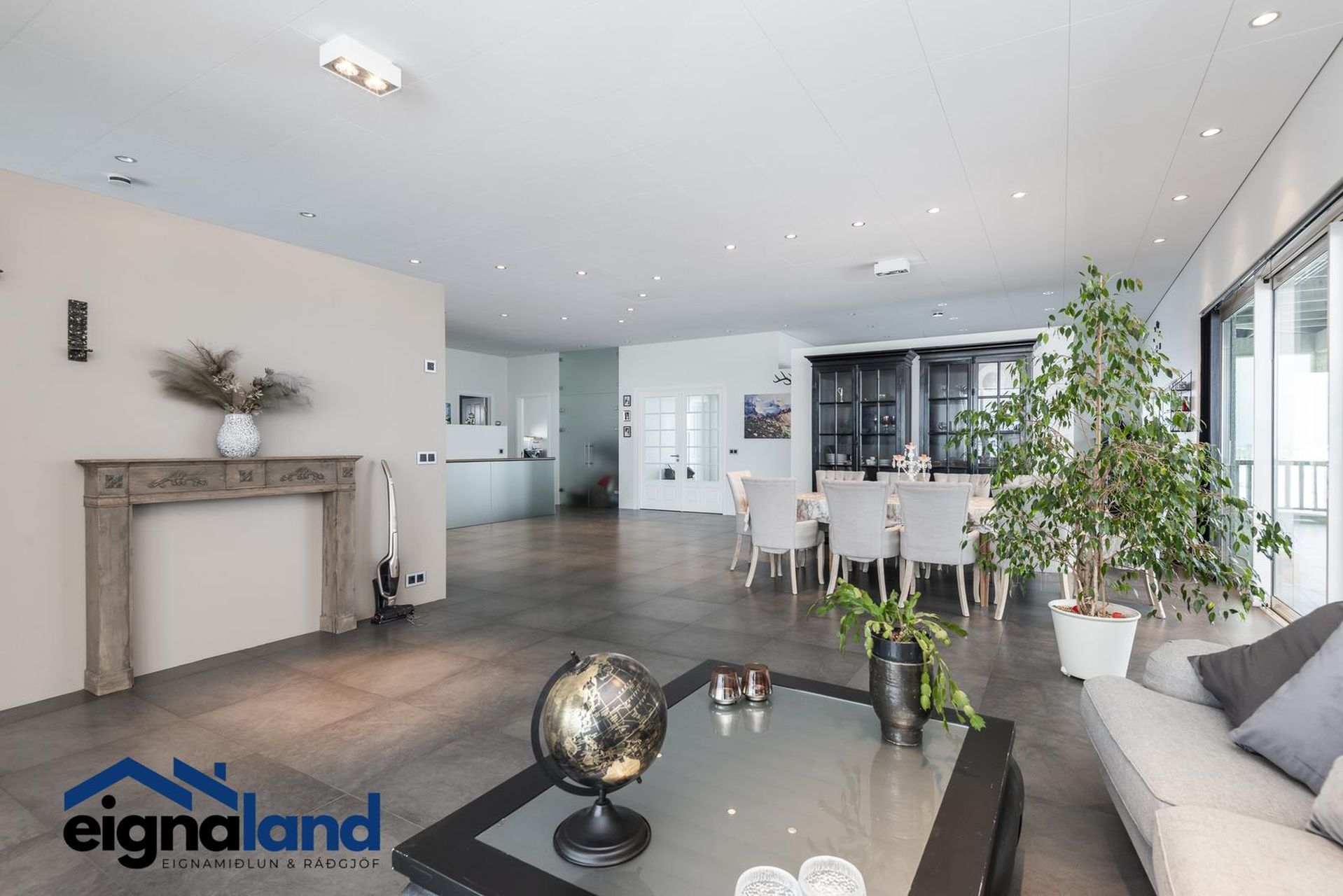 Gengið er upp virkilega veglegar tröppur með hita spiral í. Komið er inn í rúmgóða forstofu með góðu skápaplássi og gestasalerni með upphengdu salerni og innréttingu. Þaðan er komið inn í stórt alrími. Eldhúsið er stórt með fallegri innréttingu og stórri eyju í miðjunni, borðplötur eru úr steini. Eldhústæki eru öll Mile. Rennihurð er úr eldhúsi út á svalir. Stofan er björt og stór með rennihurð út á svalir. Búið er að stúka stofuna af með sjónvarpsaðstöðu. Svefnherbergin á efri hæðinni eru tvö með útgengni um rennihurð út á svalir. Aðalsvefnherbergið er mjög rúmgott með miklu skápaplássi og seinna er ágætlega rúmgott með góðu skápaplássi. Baðherbergið er flísalagt í hólf og gólf með fallegum innréttingum með steini í borðplötu, stór sturtuklefi með innbyggðum blöndunartækjum og baðkar. Þvottahúsið er rúmgott með innréttingu þar sem þvottavél og þurrkari eru í vinnuhæð.