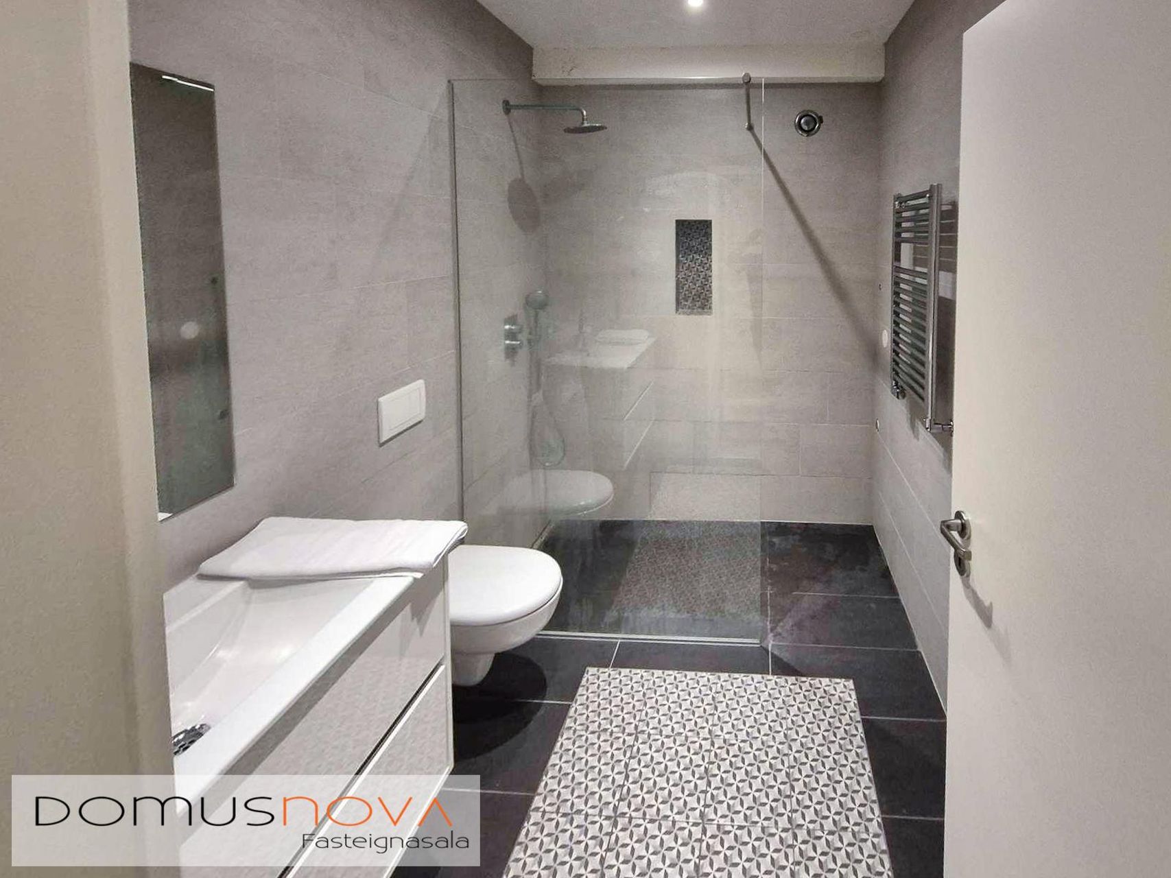 Baðherbergi: Hvít innrétting með skúffum. Upphengt salerni. Walk-in sturta. Handklæðaofn. Dökkar flísar á gólfi.