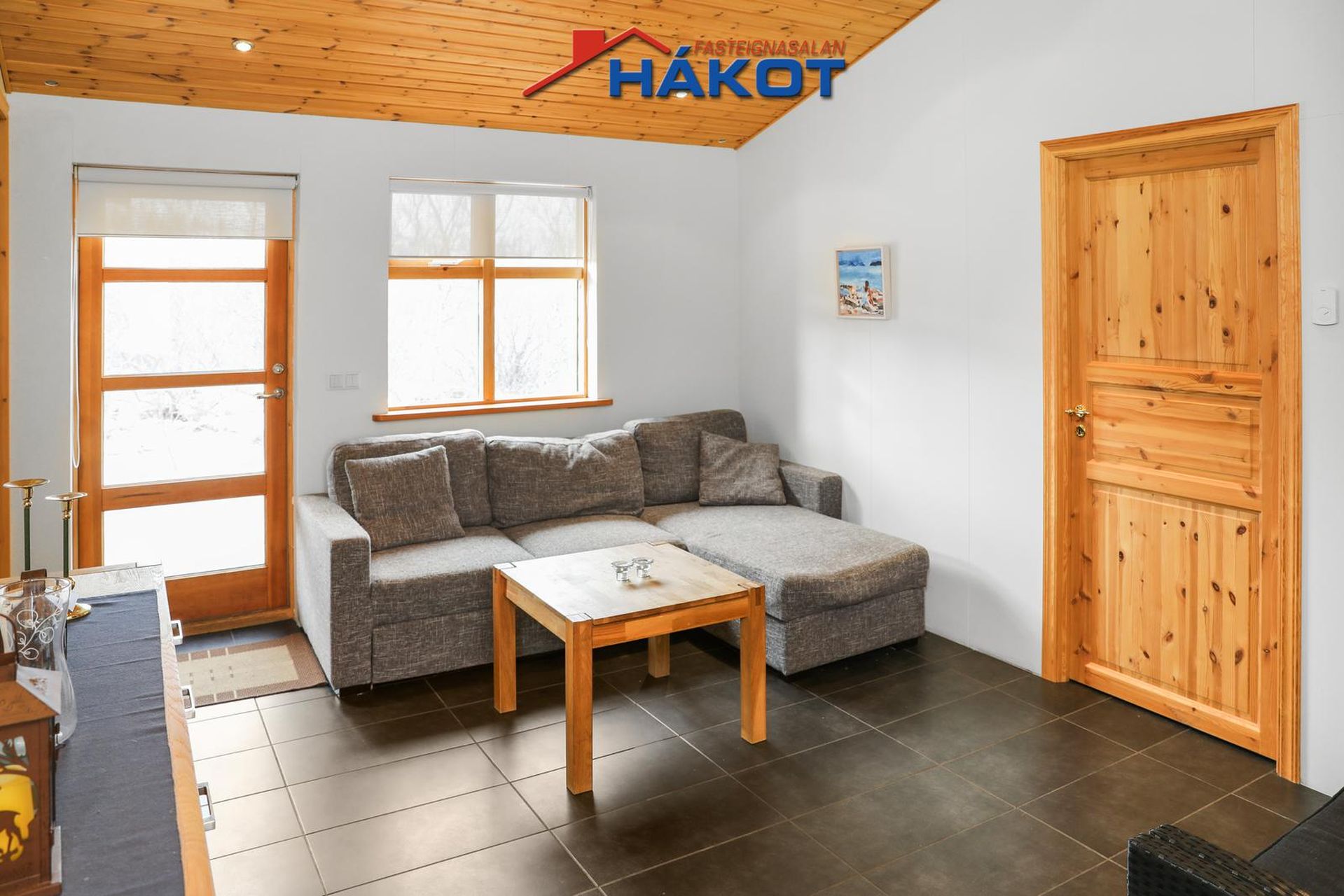 Sjónvarpshol (flísar, útgangur út á Stóra verönd með heitum pott og geymsluskúr).