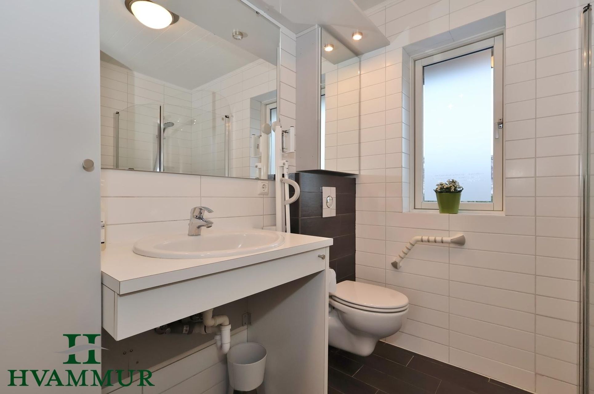 Baðherbergi er flísalagt bæði gólf og veggir, ljós innrétting, upphengt wc, sturta með glerhurðum og opnanlegur gluggi. Tengi eru fyrir þvottavél inn á baðherberginu.