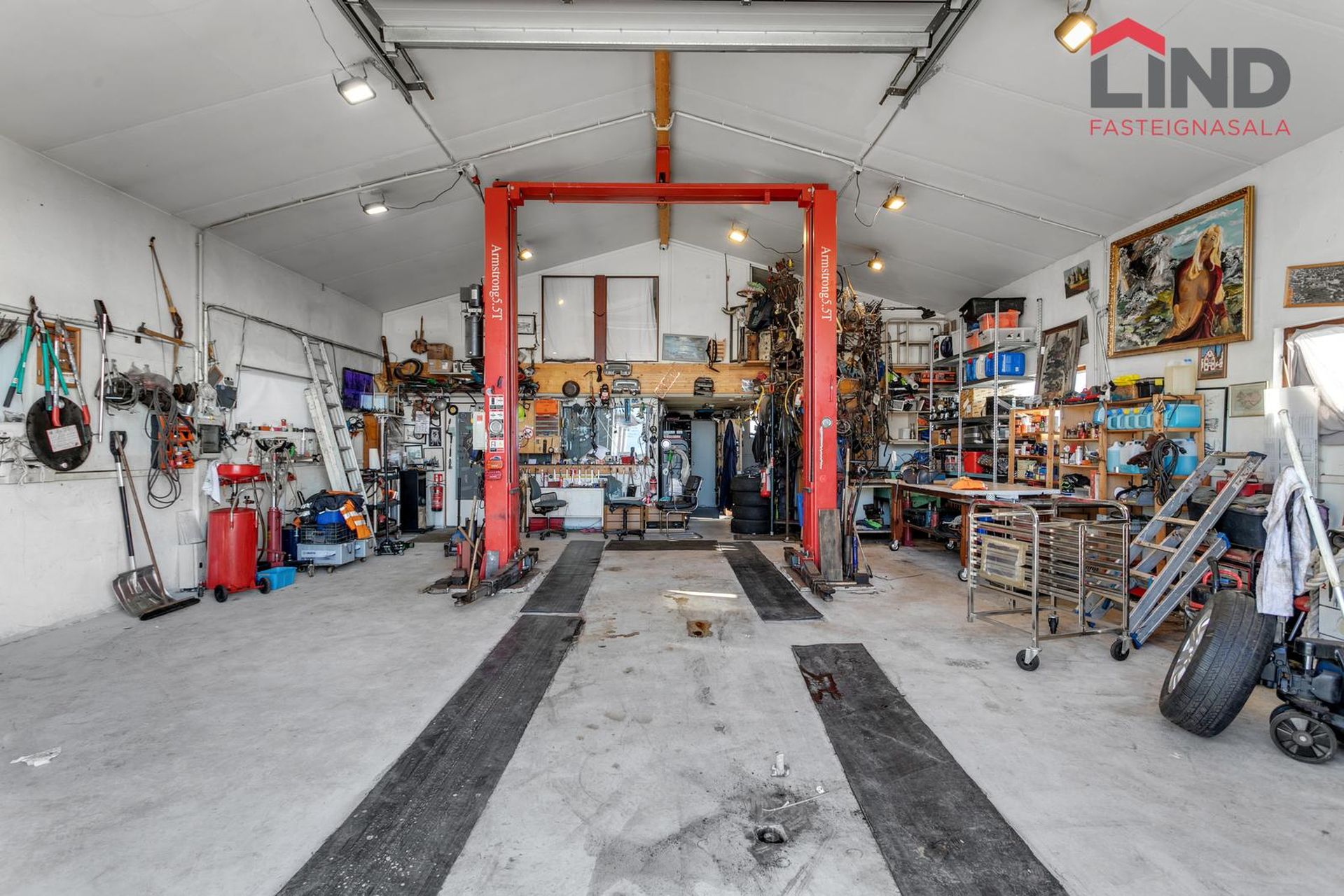 Vinnustofa/Bílaverkstæði: 145.7 fm skv. Þjóðskrá, en þar af er 16.2 fm geymsluloft sem í dag nýtist sem útleigueining. Bílalyfta, einstaklega mikil lofthæð, baðherbergi með sturtu, tengi fyrir þvottavél og þurrkara. Á efri hæðinni er lítil innrétting með vaski.
