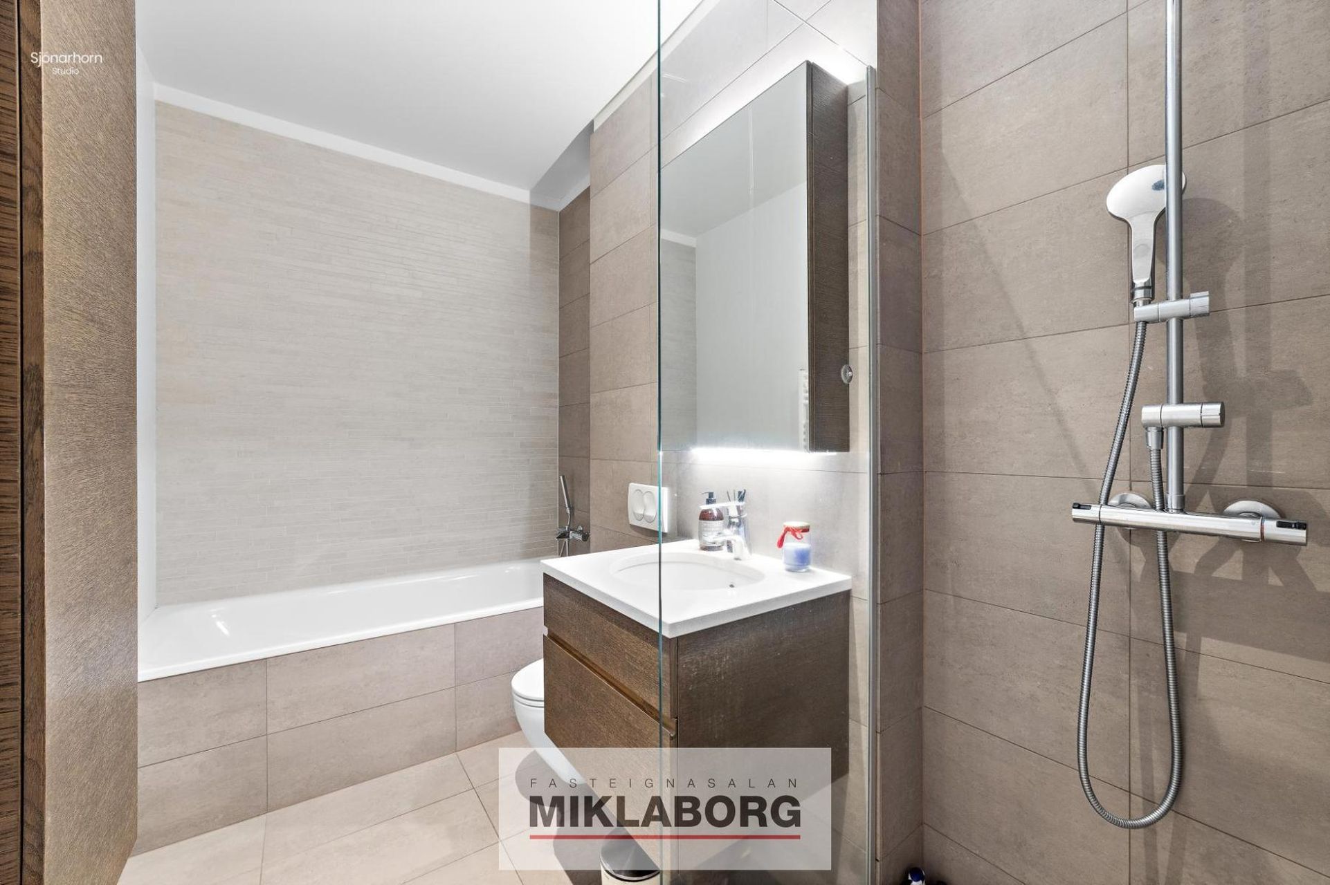 Komið er inn í flísalagða forstofu. Stofa, borðstofa og eldhús eru í opnu og björtu alrými með gólfsíðum gluggum og útgengi á vestur-svalir. Eldhús er með fallegri innréttingu og góðu skápa- og vinnusplássi. Hvítur kvarts-steinn, undirlímdur vaskur, bökunarofn í vinnuhæð og innbyggð uppþvottavél eru í eldhúsi. Aðal baðherbergið er bæði með sturtu og baðkari, góðri innréttingu og upphengdu salerni. Hjónasvíta er rúmgóð og björt með stórum gólfsíðum gluggum og innbyggðum fataskápum. Inn af herberginu er sér baðherbergi með upphengt salerni, sturtu, baðinnréttingu og handklæðaofni. Tvö góð barnaherbergi og er annað þeirra sérlega rúmgott. Þvottahús er með flísum á gólfi, skolvask og tengi fyrir bæði þvottavél og þurrkara. Eigninni fylgir 7,2 fm geymsla í kjallara ásamt sérmerktu bílastæði í bílakjallara þar sem búið. Búið að er leggja lagnir fyrir rafhleðslustöðvar.