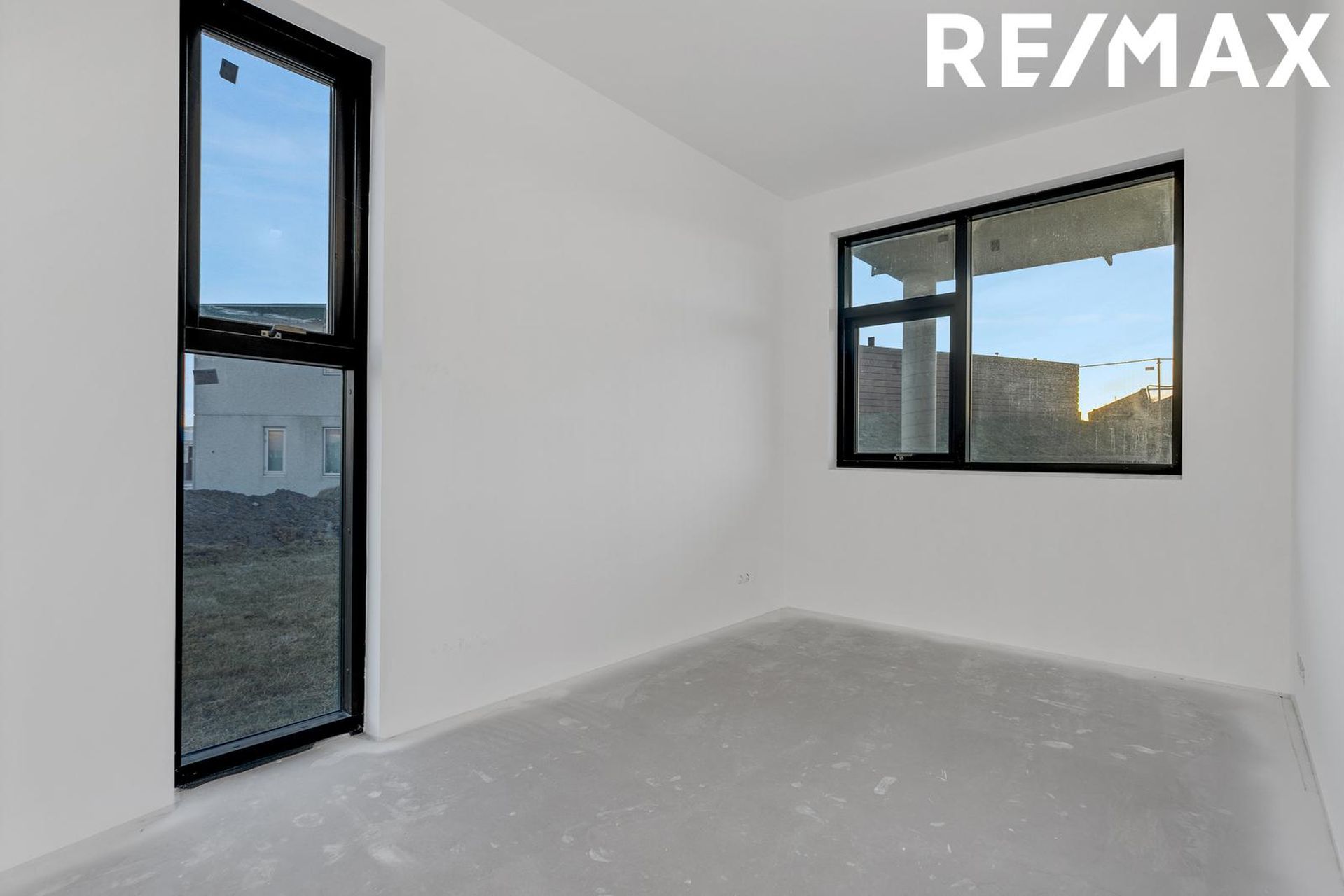 Að utan á neðri hæð og innan af svölum á efri hæð á eftir að þrífa og lakka sjónsteypuna að utan.
