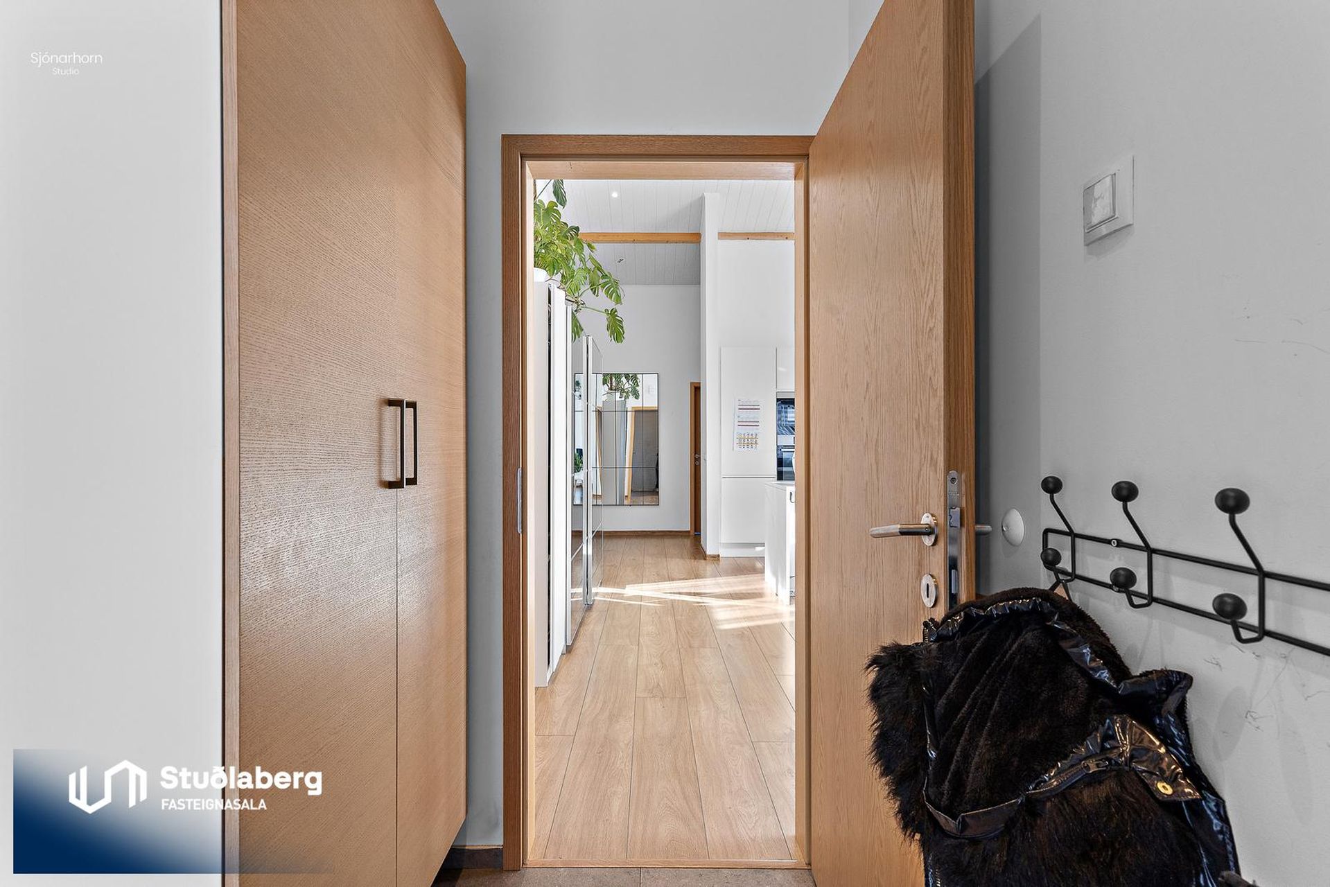 Forstofa með flísum á gólfi, þar er góður skápur.