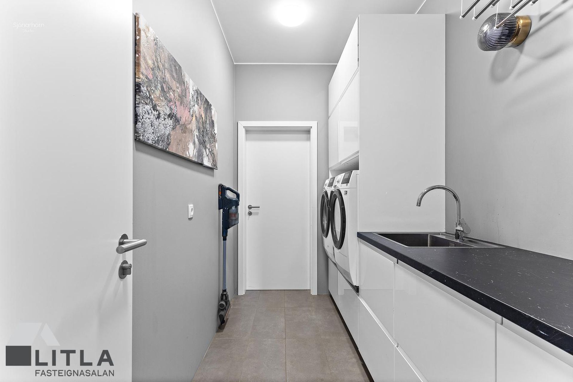Þvottahús með hvítri innréttingu, flísar á gólfi, vinnubekkur, vaskur og innangengt í bílskúr.
