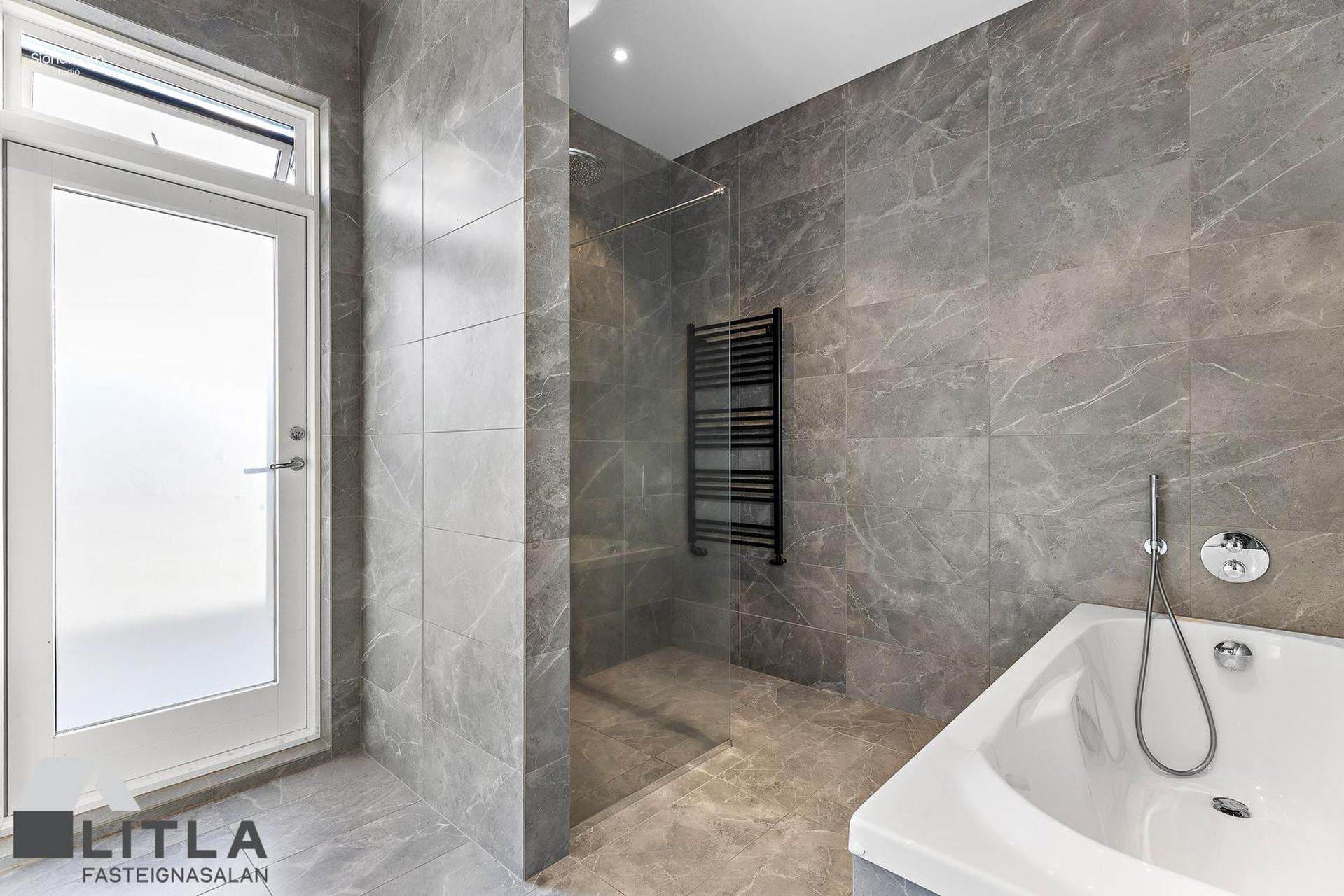 Baðherbergi er flísalagt í hólf og gólf, með baðkari og inngengri sturtu, með hvítri innréttingu upphengt salerni og handklæðaofn. Hurð beint út á pall með góðu aðgengi að heitum potti.