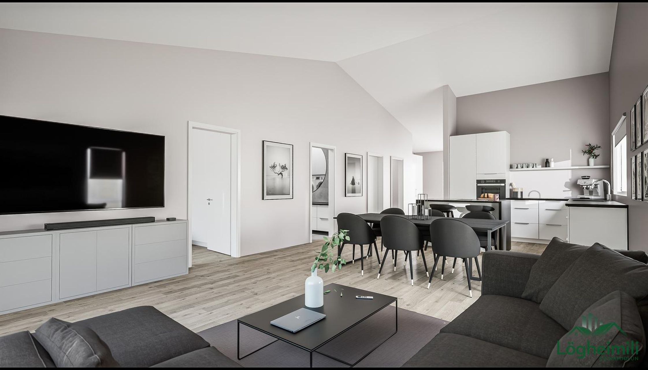 Alrými: Stofa, borðstofa og opið eldhús eru í opnu björtu rými. Gert er ráð fyrir veglegri eldhúsinnréttingu, með tilheyrandi tækjum.