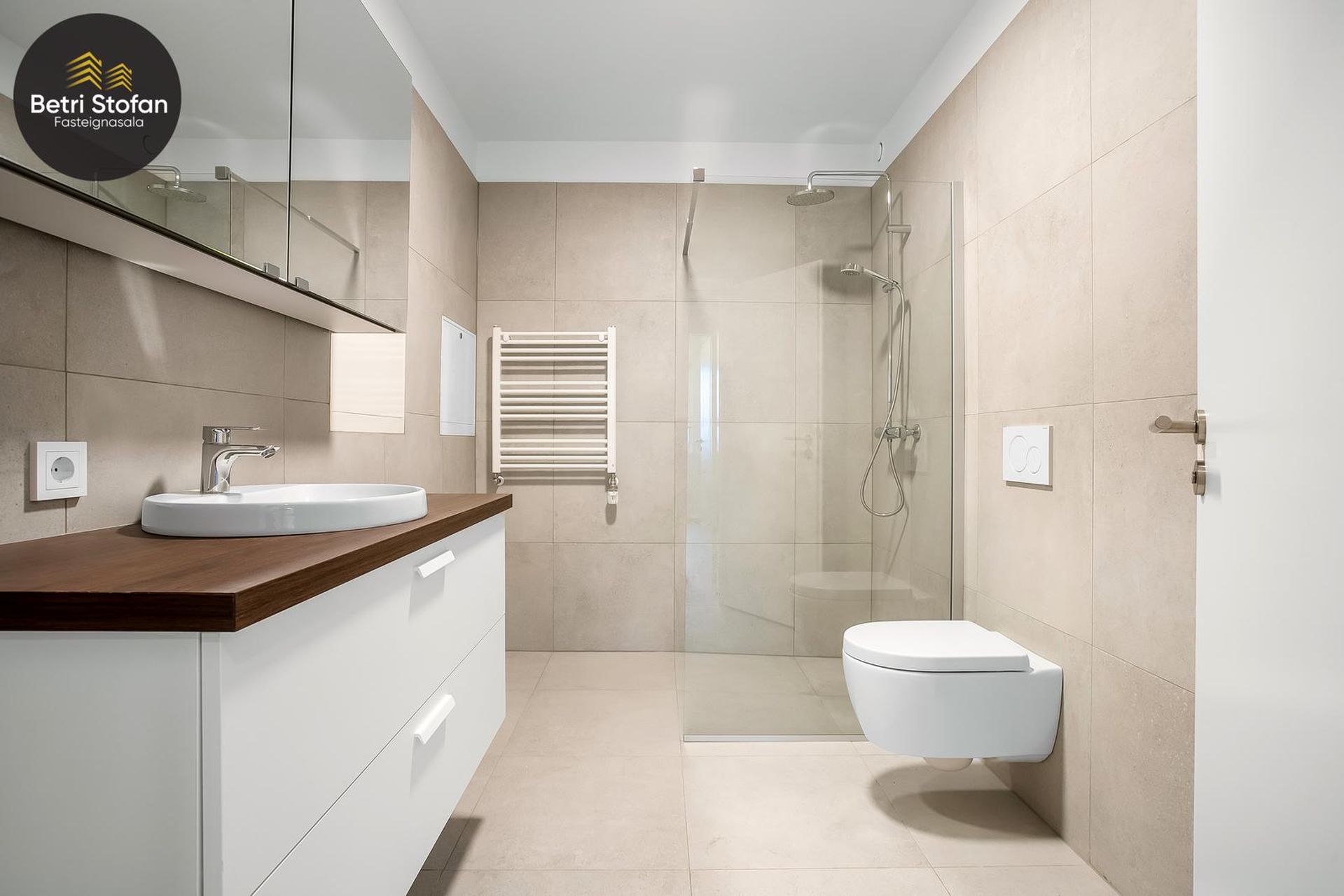 Baðherbergi: Innrétting með handlaug. Speglaskápur. Upphengt salerni. Sturta með sturtugleri.Handklæðaofn. Ljósar flísar á gólfi og veggjum.