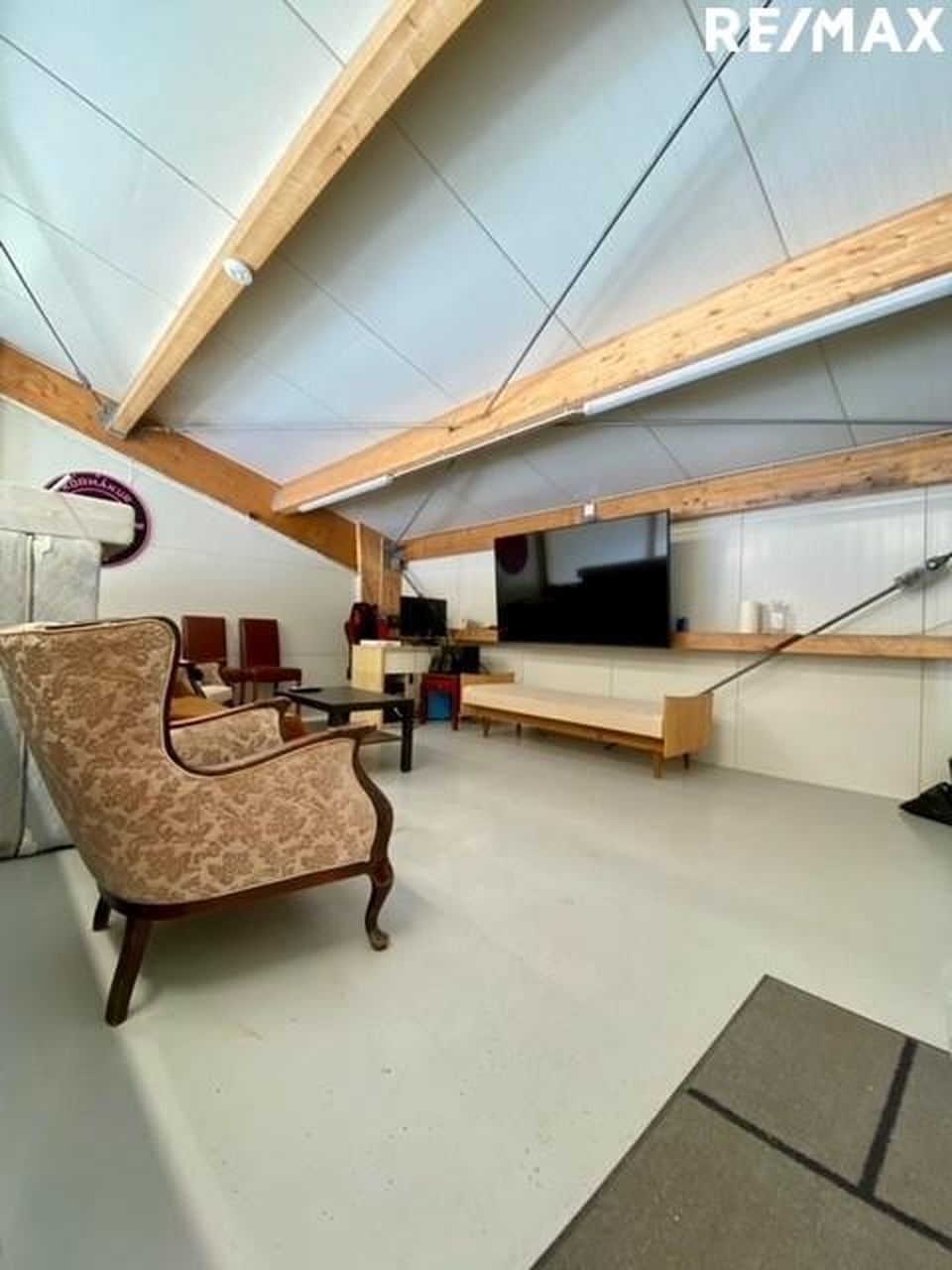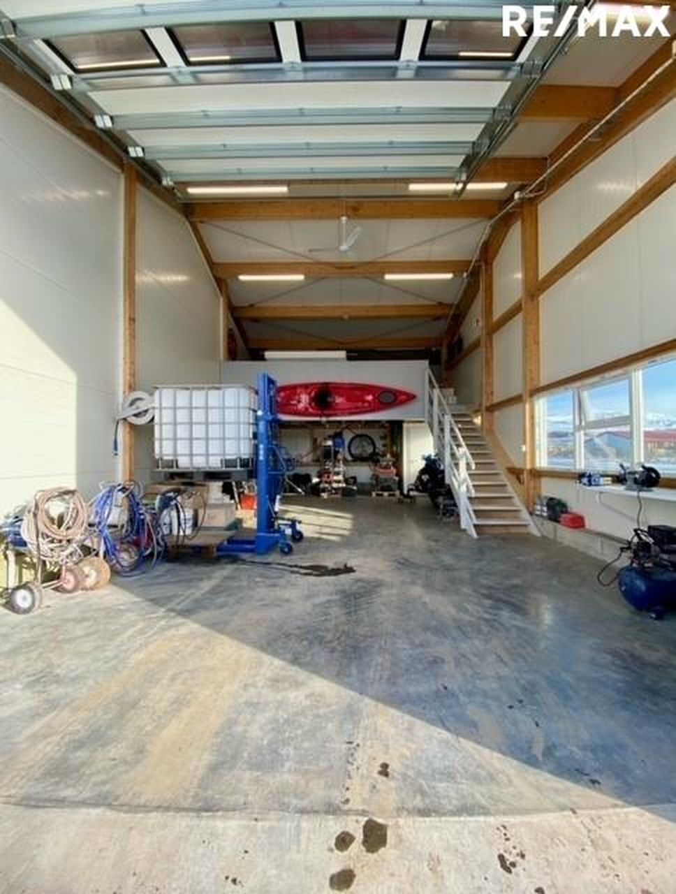 Neðri hæð er salerni, inngangshurð og stóri iðnaðarhurð að stærð h 4,20 m og b 4,0 m.