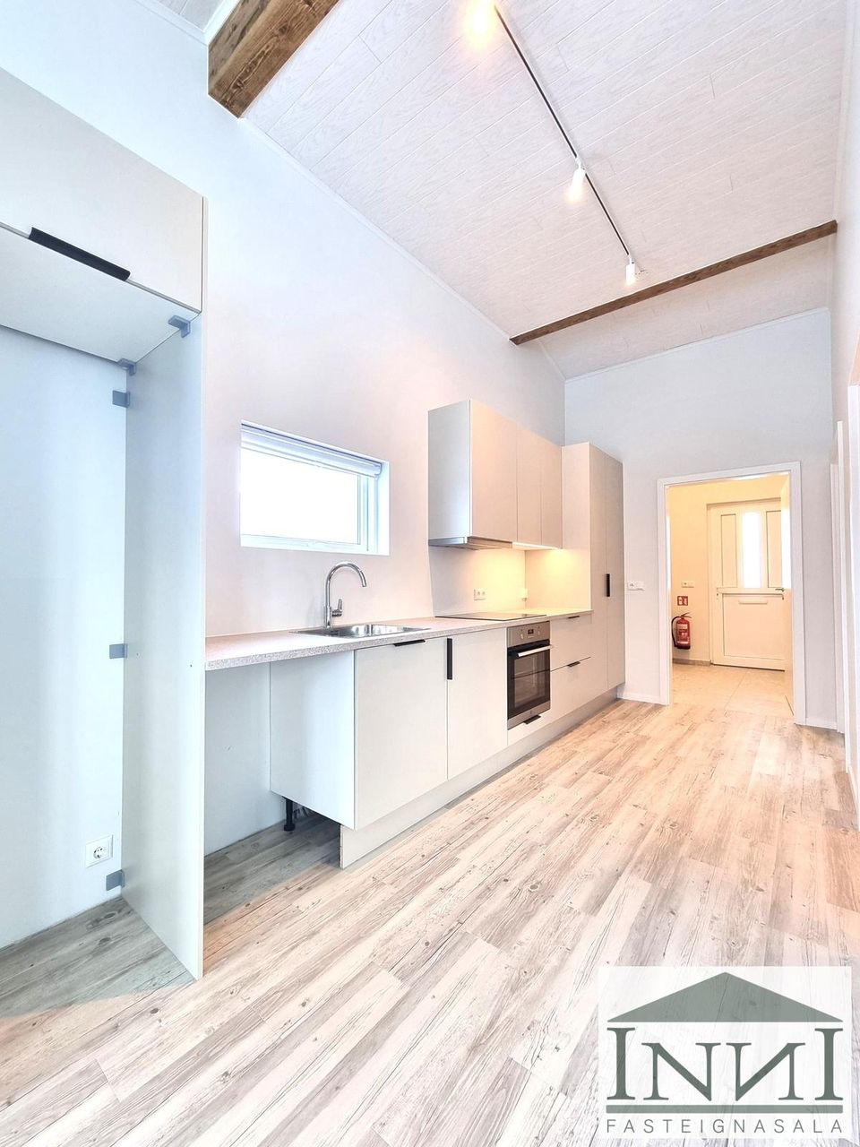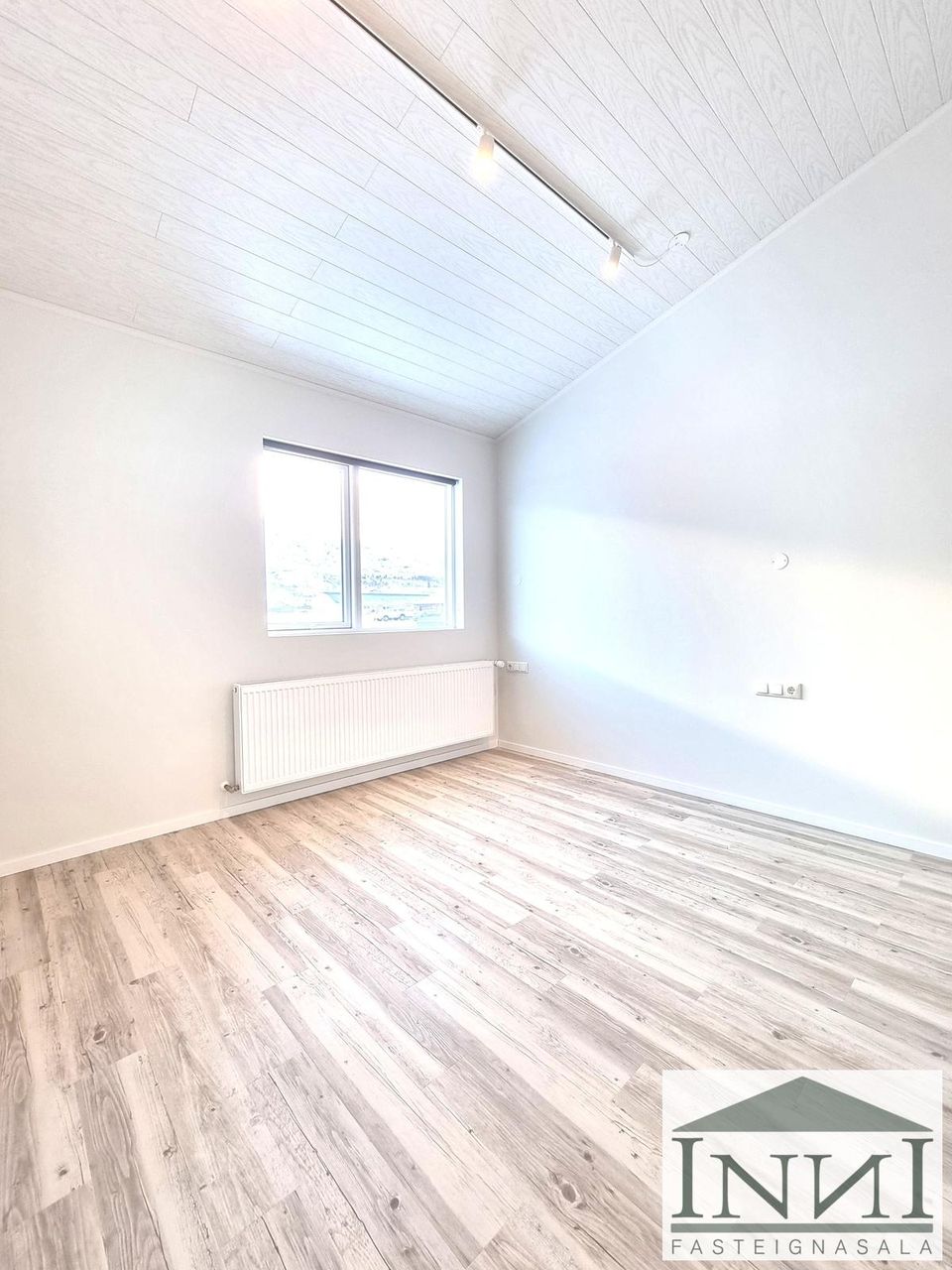 Stofa og eldhús eru í opnu rými með parket á gólfi og útgengt er úr stofu í garð. Baðherbergi er flísalagt í hólf og gólf, þar er sturta, handklæðaofn og flott innrétting. Tengi fyrir þvottavél og þurrkara er á baðherbergi. Svefnherbergi er rúmgott með parket á gólfi og fjórföldum fataskáp.