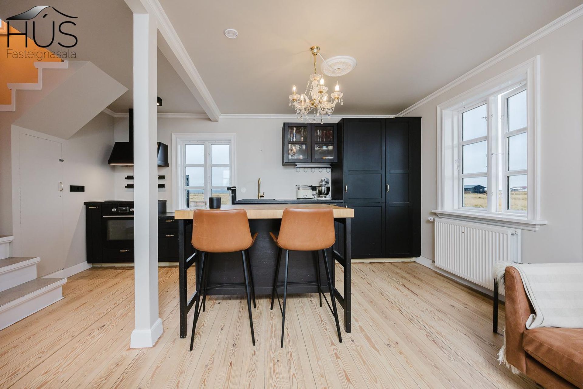 Eldhús og stofa opið í eitt. Nýleg svört viðarinnrétting. Spanhelluborð. Innfelld uppþvottavél og ísskápur. Gólfborð á gólfum. Dúklagður timburstigi milli hæða. Skápur undir stiga.