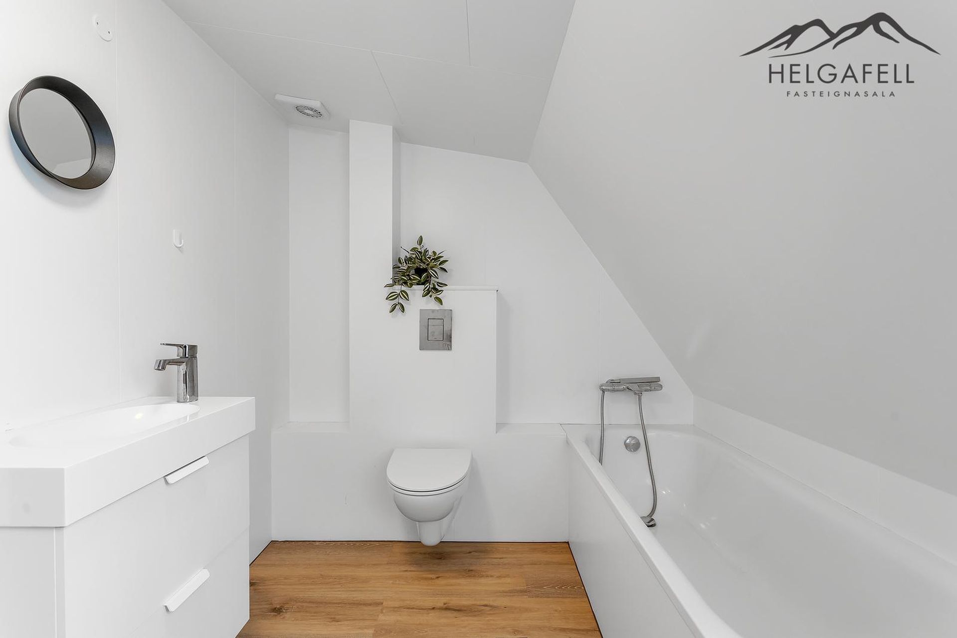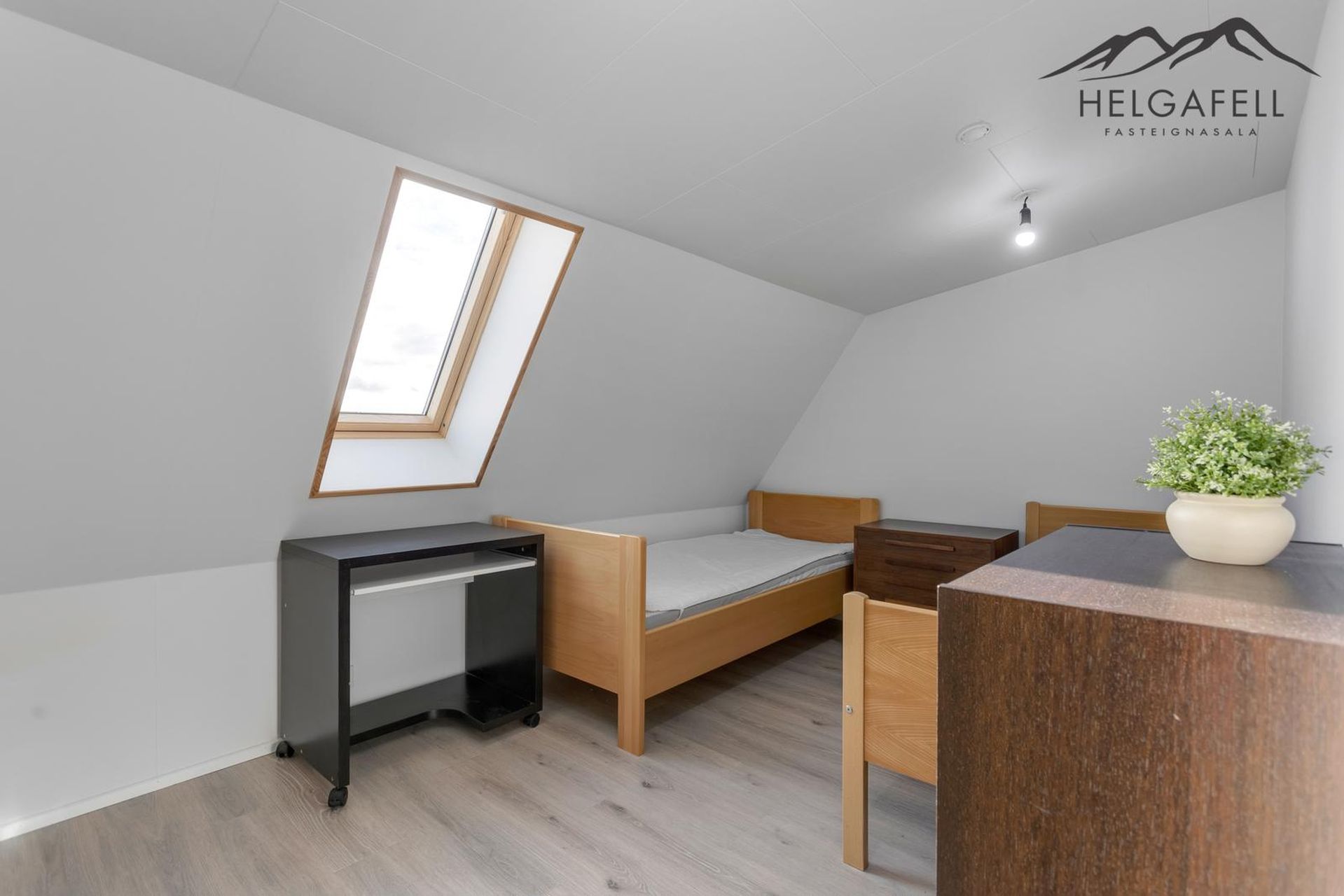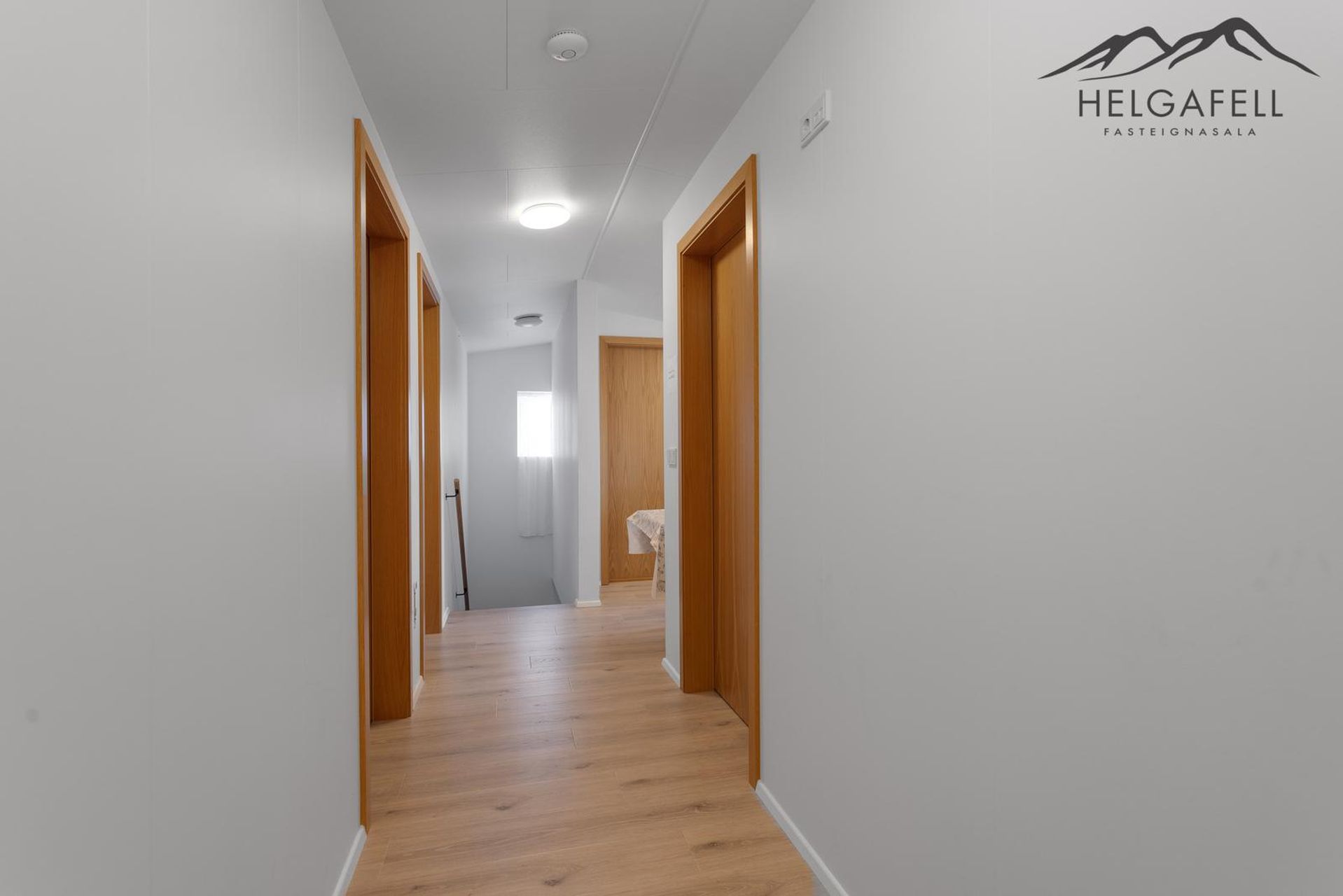 Nánari lýsing: Teppalagður stigi liggur frá gangi á efri hæð. Þaðan liggur gangur að öðrum rýmum. Harðparket á gólfi. Eldhús með lítilli innréttingu þar sem gert er ráð fyrir litlum ísskáp. Stálvaskur. Á baðherbergi er vaskinnrétting, upphengt salerni, baðkar og gluggi. Fjögur parketlögð herbergi.