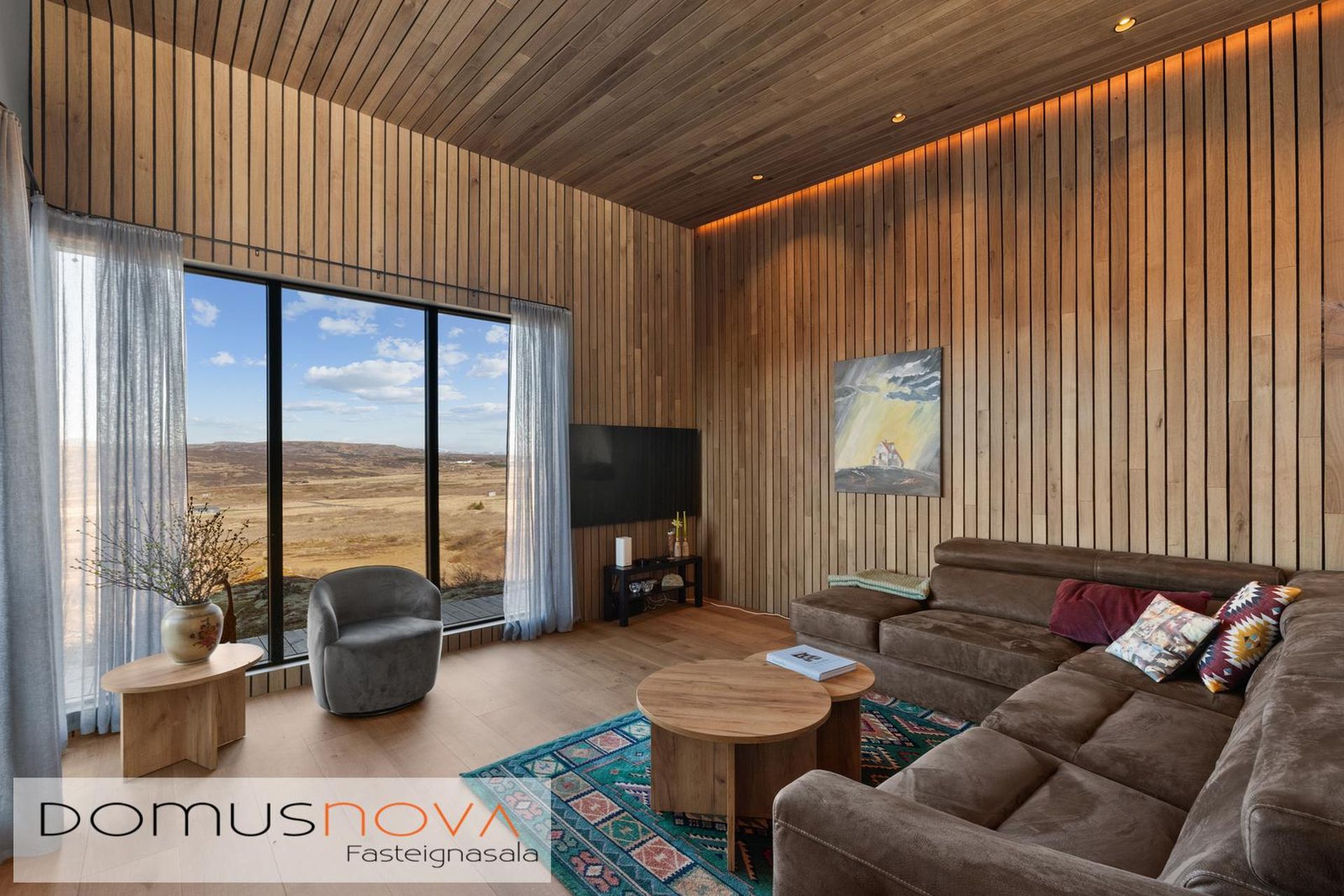Stofa - stendur neðar framst (vesturhluta) aðalrýmis, gengið niður tröppur í setustofuna með fallegu útsýni um gólfsíða útsýnisglugga móti vestri og suðri.