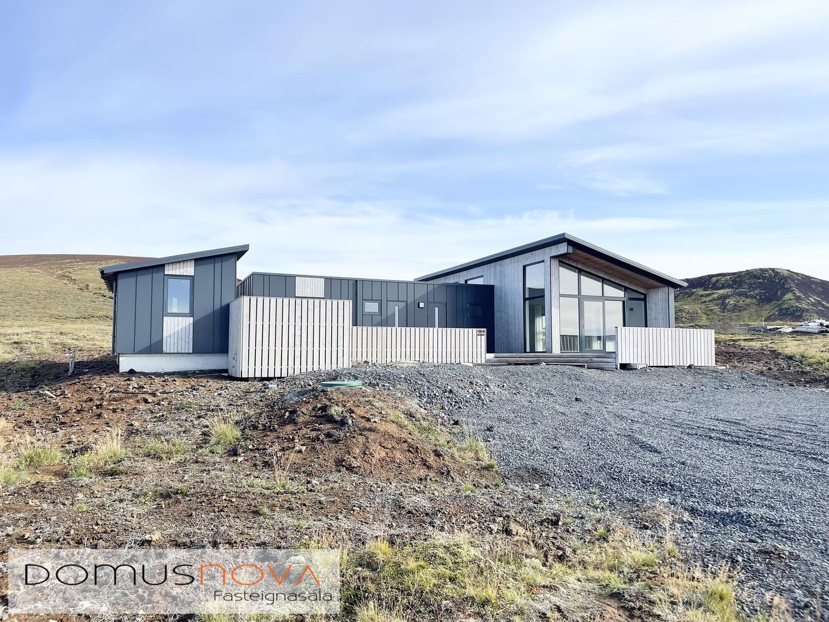 Það er ein halla og er húsið klætt að utan með ál og viðarklæðningu.