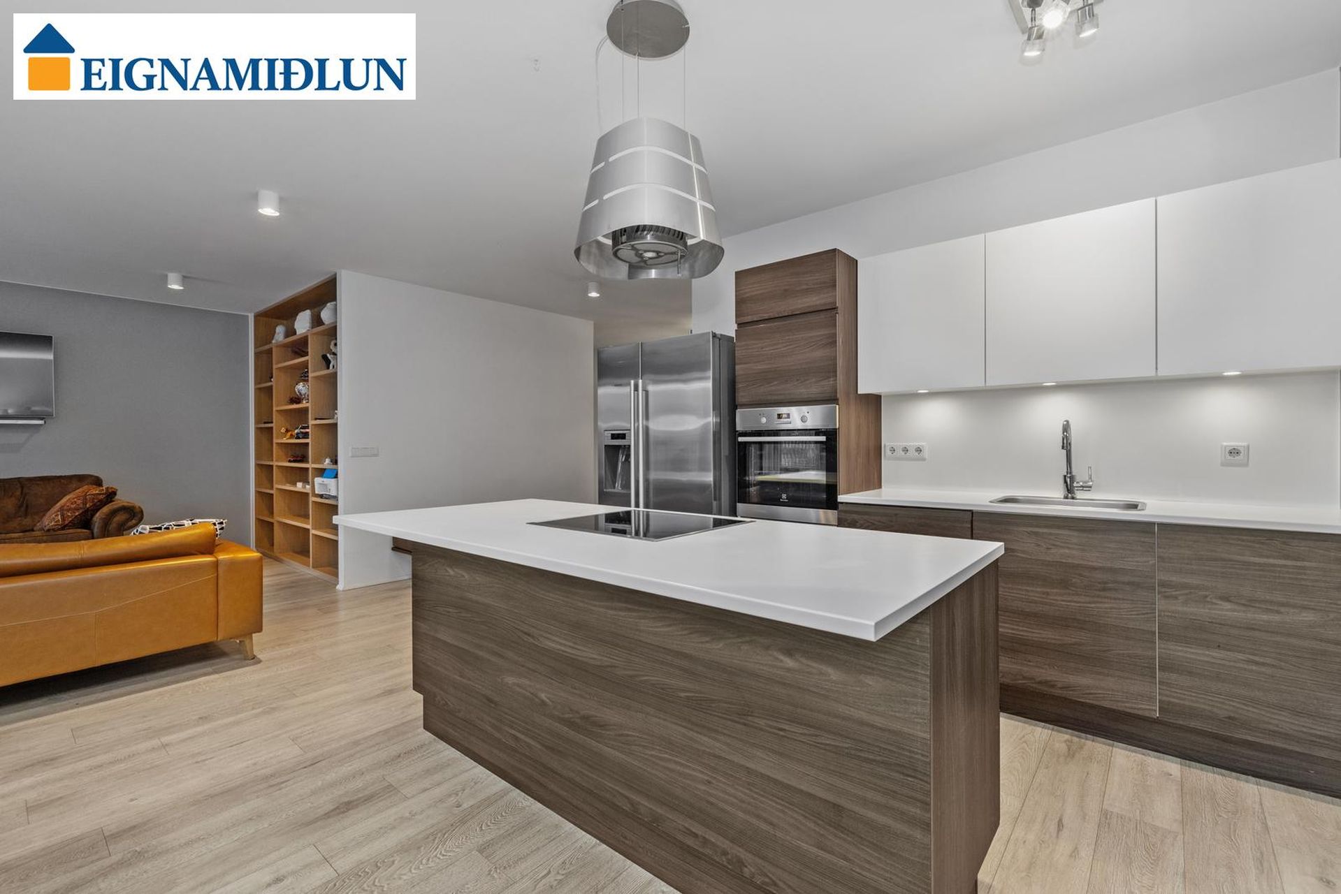 Eldhús: Opið við stofu, dökk innrétting, hvítir efri skápar, eyja með skúffum, helluborð og háfur, innbyggð uppþvottavél.