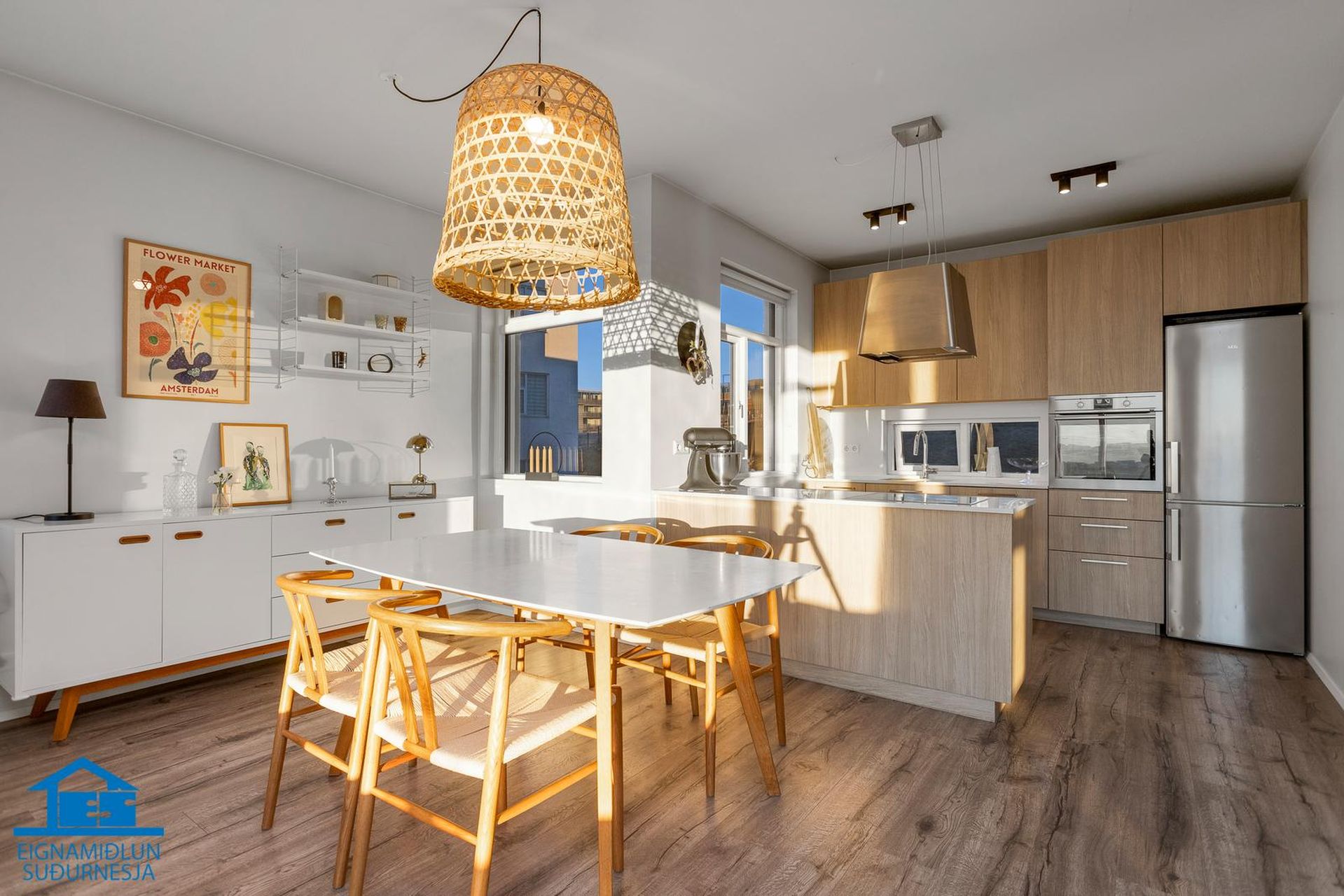 Íbúðin er björt og rúmgóð með gluggum til þriggja átta. Alrými með eldhúsi og stofu er opið og fallegt, með útgengi á svalir með svalalokun þar sem útsýnið nýtur sín til fulls. Eldhús og innréttingar eru vandaðar, í samræmdum stíl og heildaryfirbragð eignarinnar er fágað og tímalaust.