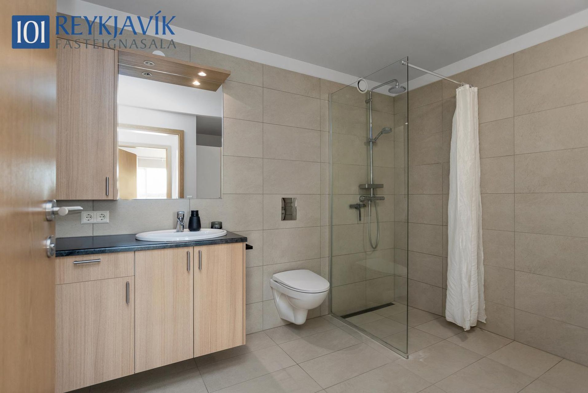 Baðherbergi flísalagt gólf og veggir. Baðinnrétting með skápum og handlaug á borði. Spegill með lýsingu fyrir ofan. Salerni, handklæðaofn og innangengt í rúmgóða sturtu. Innrétting fyrir þvottavél og þurrkara eru á baði ásamt góðum línskáp.