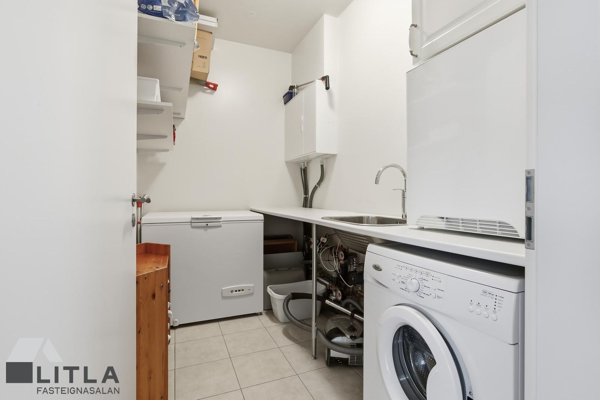 Þvottahús með vinnubekk og skolvaski, tengi fyrir þvottavél og þurrkara og hillur eru til staðar.