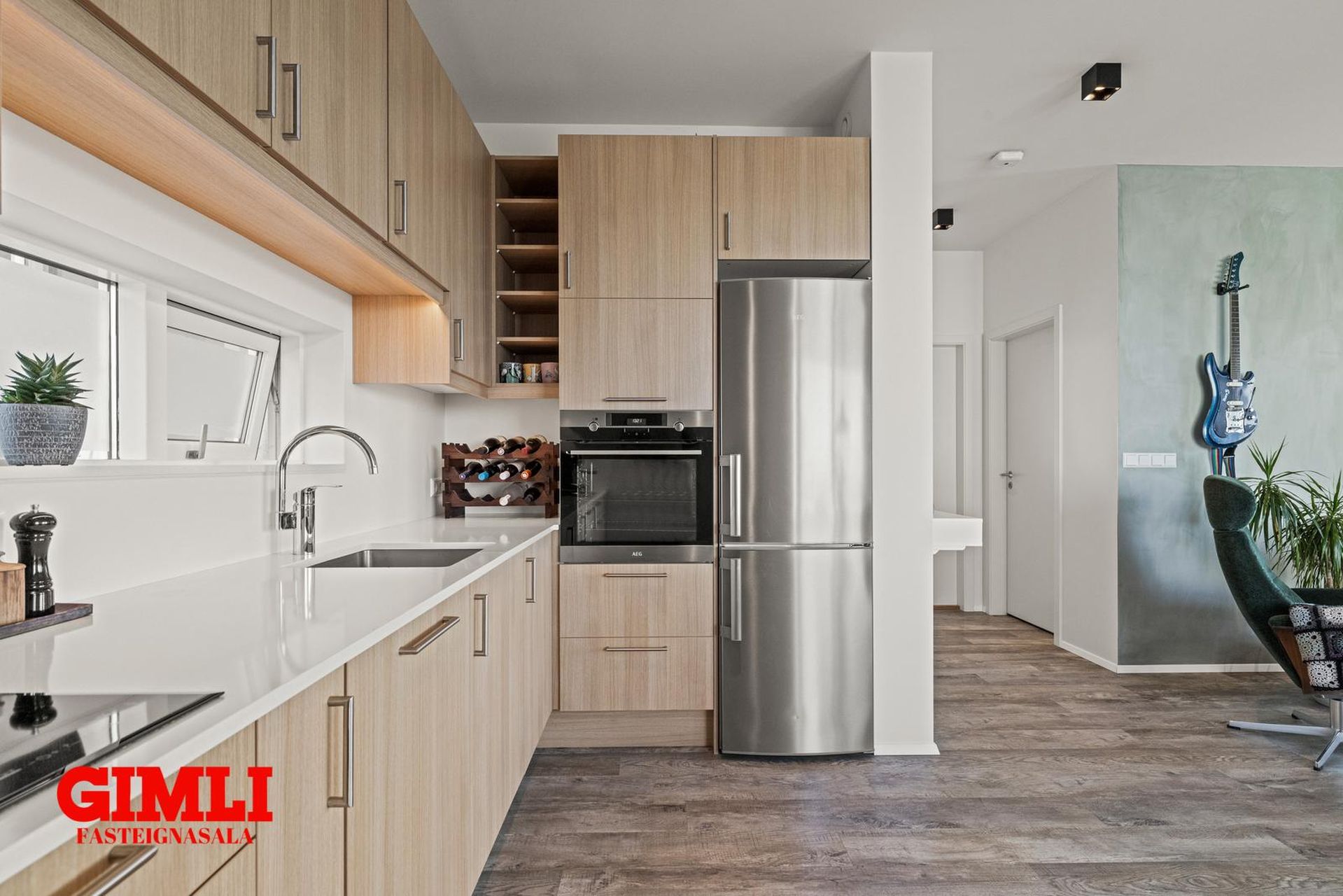 Eldhús: í opnu rými með borðstofu. L-laga viðarinnrétting, ofn í vinnuhæð og gluggi. Innbyggð uppþvottavél. Kvarz borðplata.