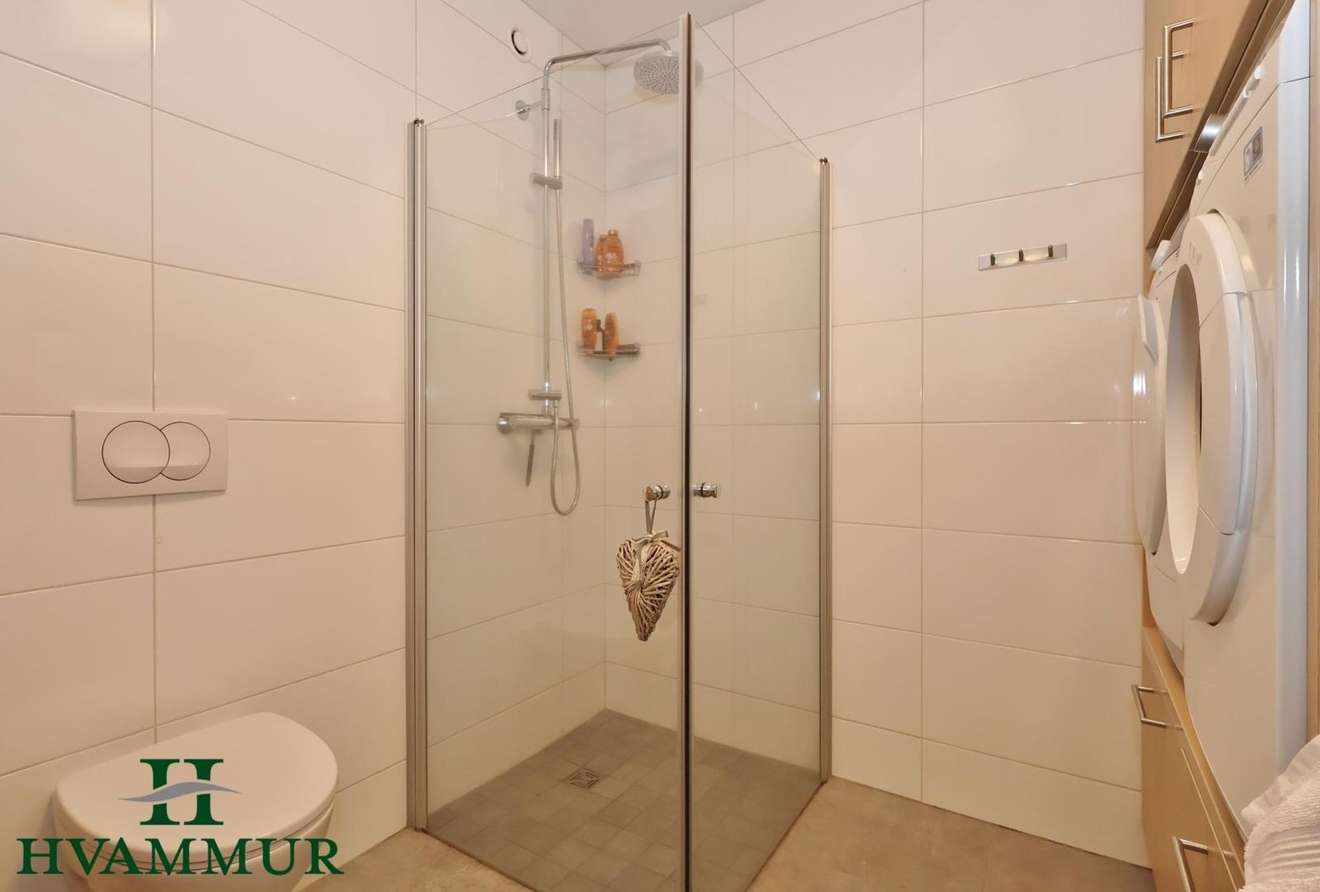 Baðherbergi er flísalagt bæði gólf og veggir, vönduð innrétting er úr plastlagðri struktur-eik og speglaskápur, upphengt wc og sturta með glerhurðum. Stæði er í innréttingu fyrir þvottavél og þurrkara í vinnuhæð.