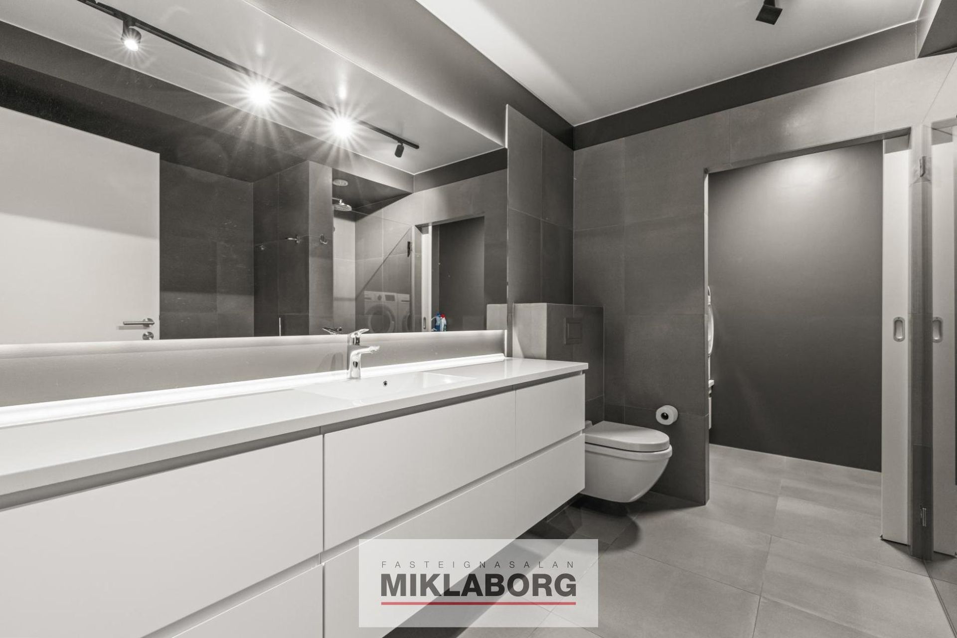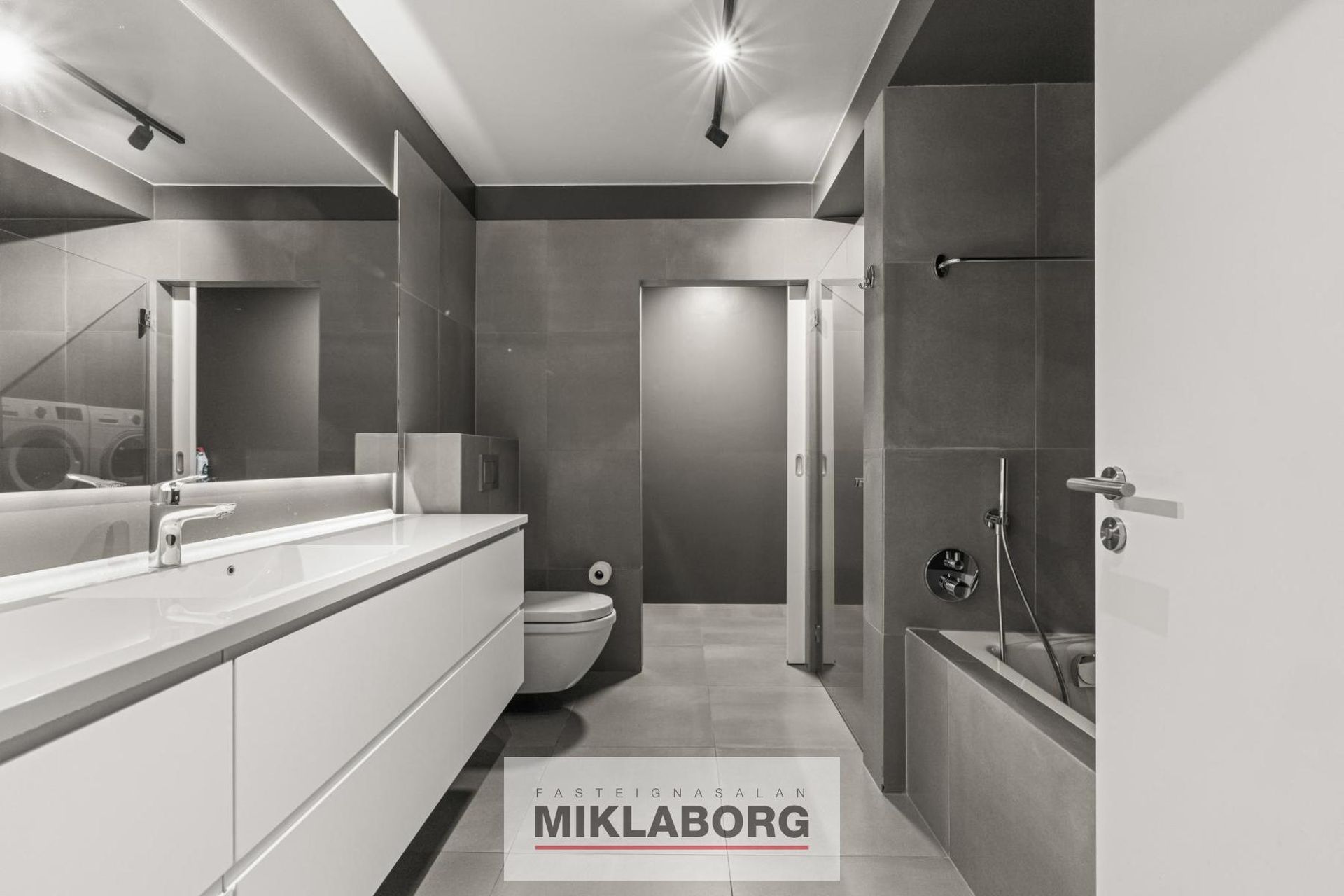 Baðherbergi og þvottahús: Góð baðinnrétting. Upphengt WC, sturta og baðkar. Flísar á gólfi og í kringum sturtu og baðinnréttingu. Þvottahús innaf baðherbergi. Innrétting fyrir þvottavél og þurrkara og skolvaskur með borðplötu.