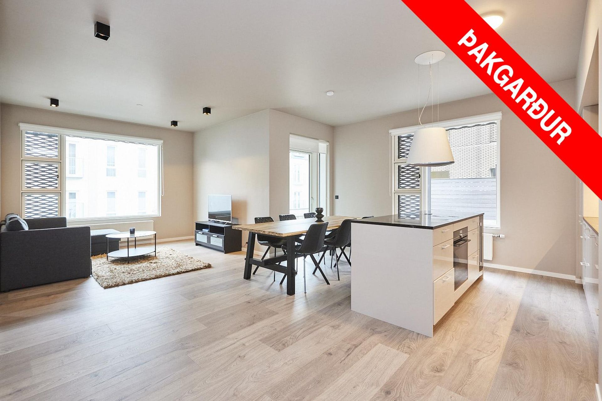 Stofa: Með harðparketi á gólfi og gluggum í tvær áttir. Stofa er opin við eldhús og rúmar setustofu og borðstofu.