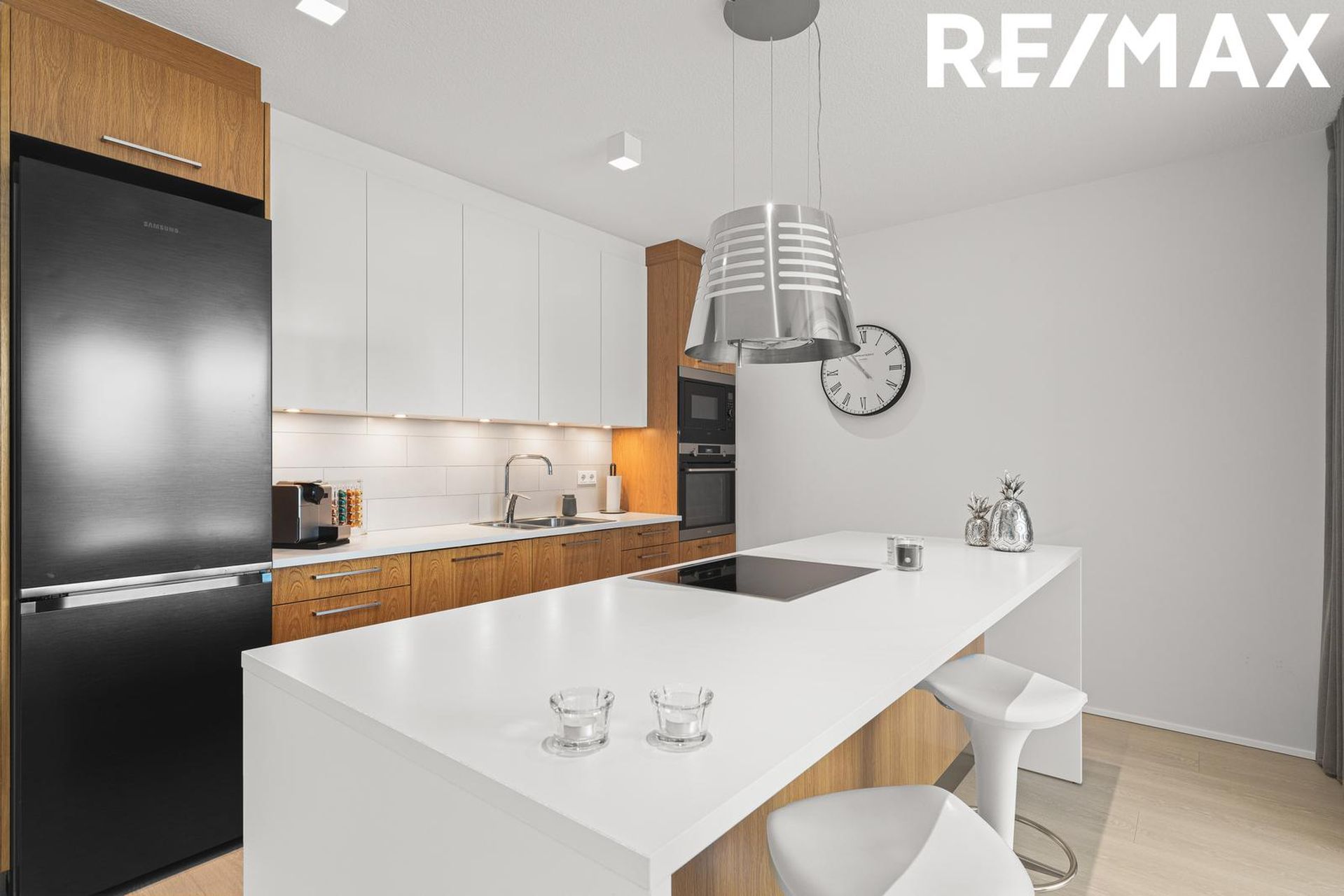 Eldhús: rúmgott og bjart, falleg hvít og eikar innrétting frá Brúnás með eyju sem hægt er að sitja við, steinn á borðum. Eldhústæki frá AEG, helluborð, ofn og combiofn ásamt háfi.