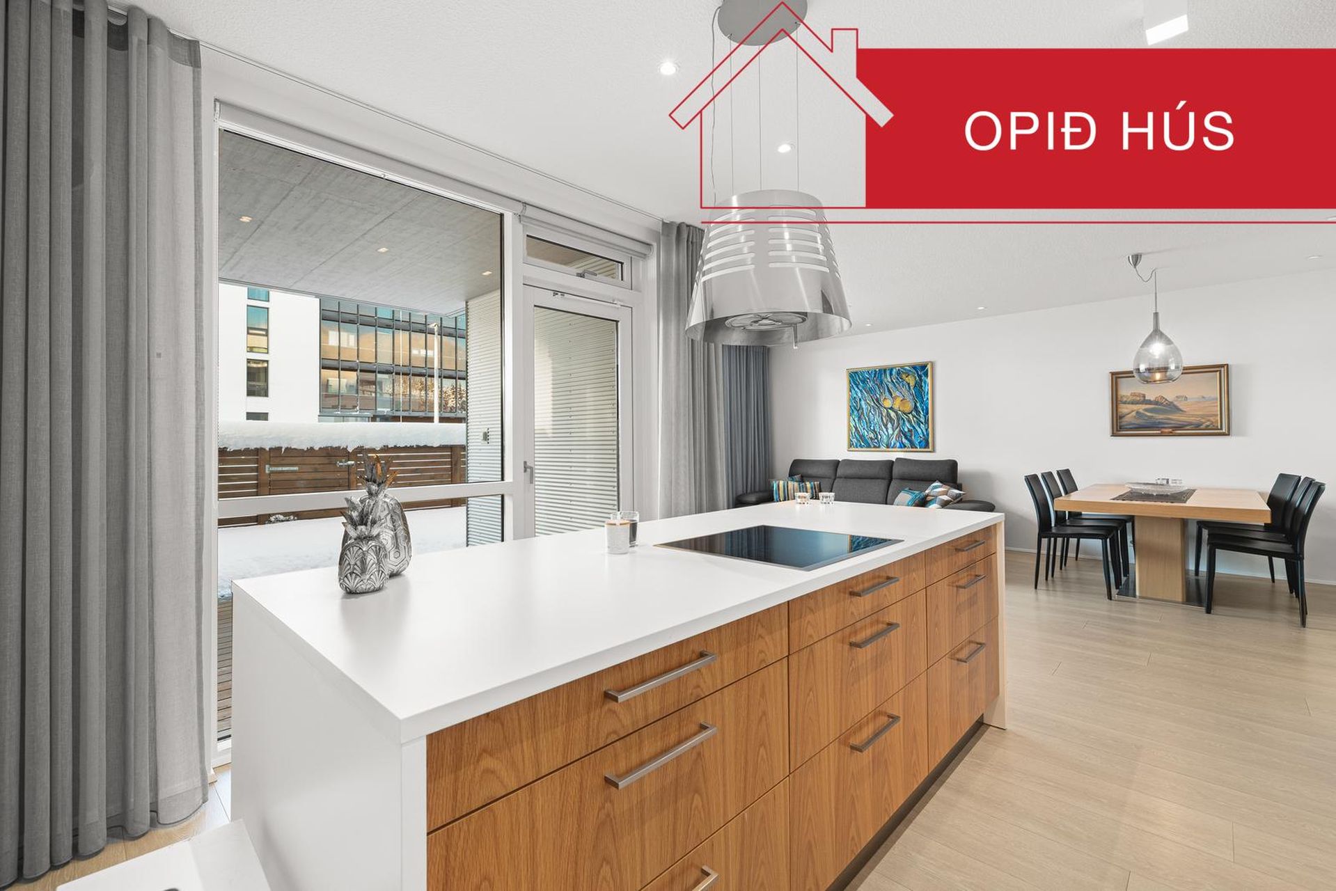 Alrými: alrými með stofu og borðstofu og eldhúsi, útgengi er út á afgirtan sannkallaðan sælureit þar sem sólin skín allan daginn.