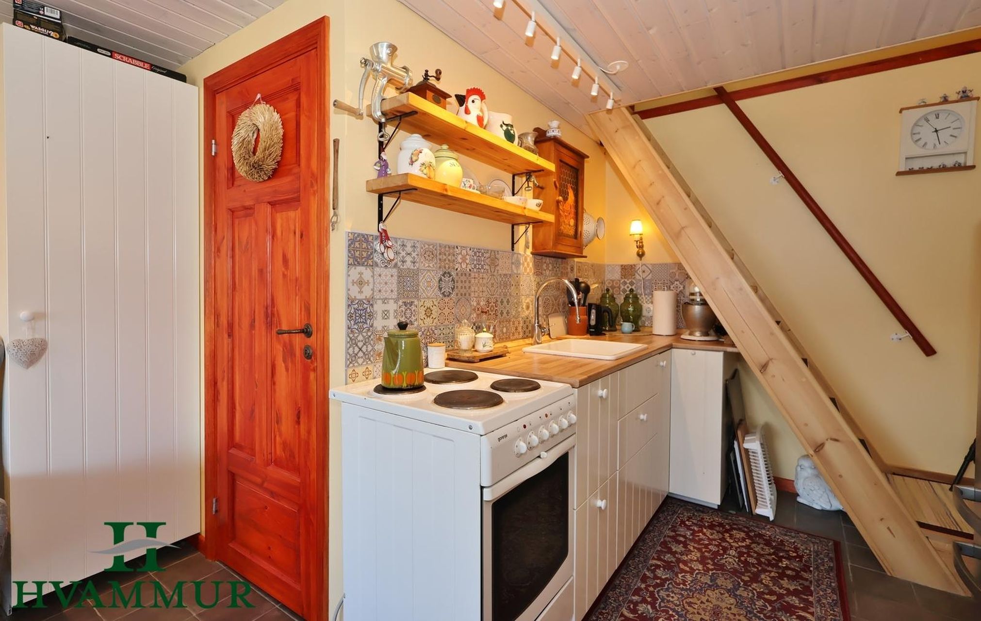 Eldhúshorn er innst við hliðina á stiganum upp í risið. Þar er hvít innrétting með hvítum vask og viðar bekkplötu. Flísar eru fyrir ofan innréttinguna.