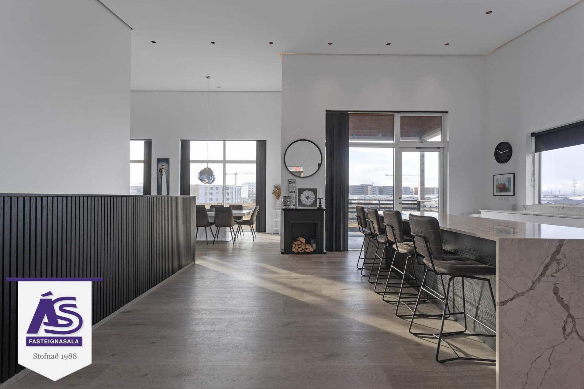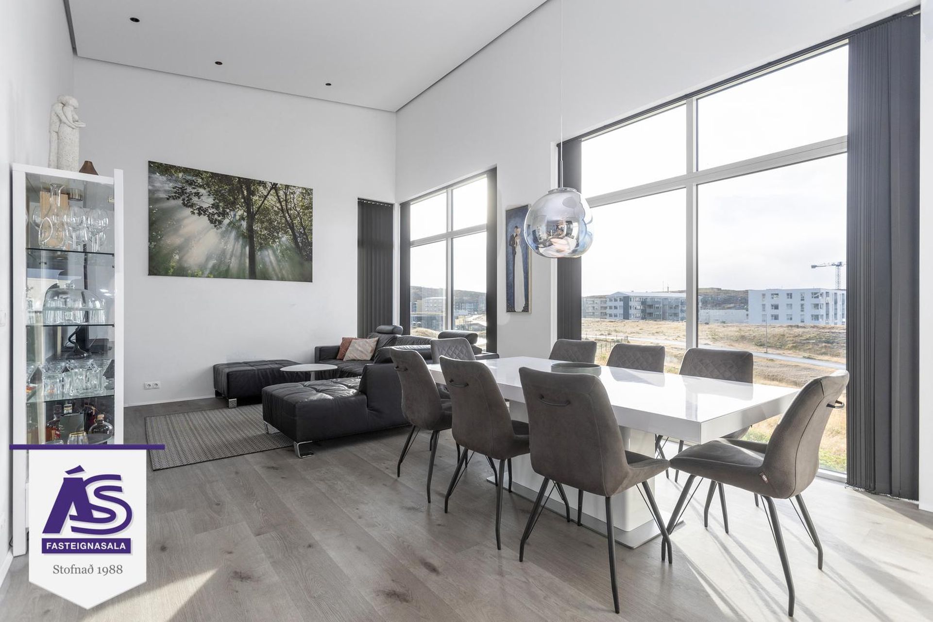 Efri hæð: Forstofa með skápum, innangengt í bílskúr úr forstofu. Gestasalerni með sturtu. Eitt svefnherbergi er á hæðinni. Eldhús, stofa og borðstofa í björtu alrými með aukinni lofthæð, útg. á svalir. Eldhúsið er með góðu skápaplássi, búrskápur, stór eyja, tveir ofnar í vinnu hæð (ofn og combi-ofn), innbyggð uppvþottavél, kvartz-steinn á borðum (einnig inní búrskáp). Stigi niður á neðri hæð úr alrými.