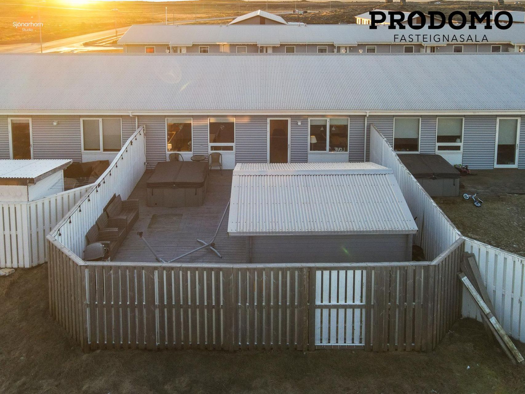 Húsið er klætt með vandaðri og viðhaldslítilli utanhússklæðningu og með vönduðum timburgluggum. Þak er klætt með AluZink og vandaðar stálrennur með hvítum niðurföllum. Þakkantar úr bandsöguðu timbri, hvítmálaðir. Stór verönd með skjóveggjum, heitum pott og 15 fm geymsluskúr.