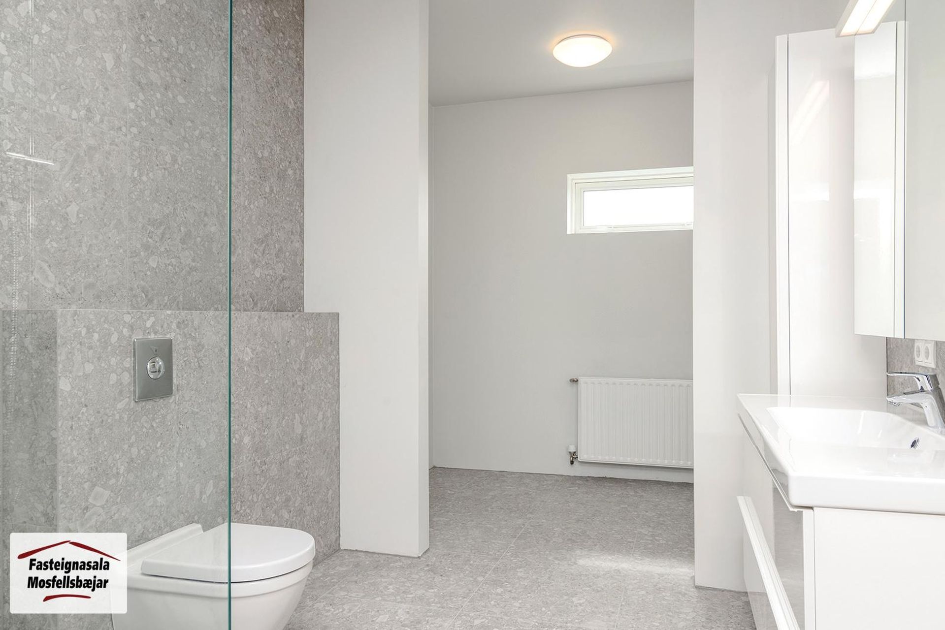 Baðherbergi er flísalagt. Á baði er vegghengt salerni, 'walk in' sturta, handklæðaofn og hvít innrétting. Innaf er þvottaherbergi