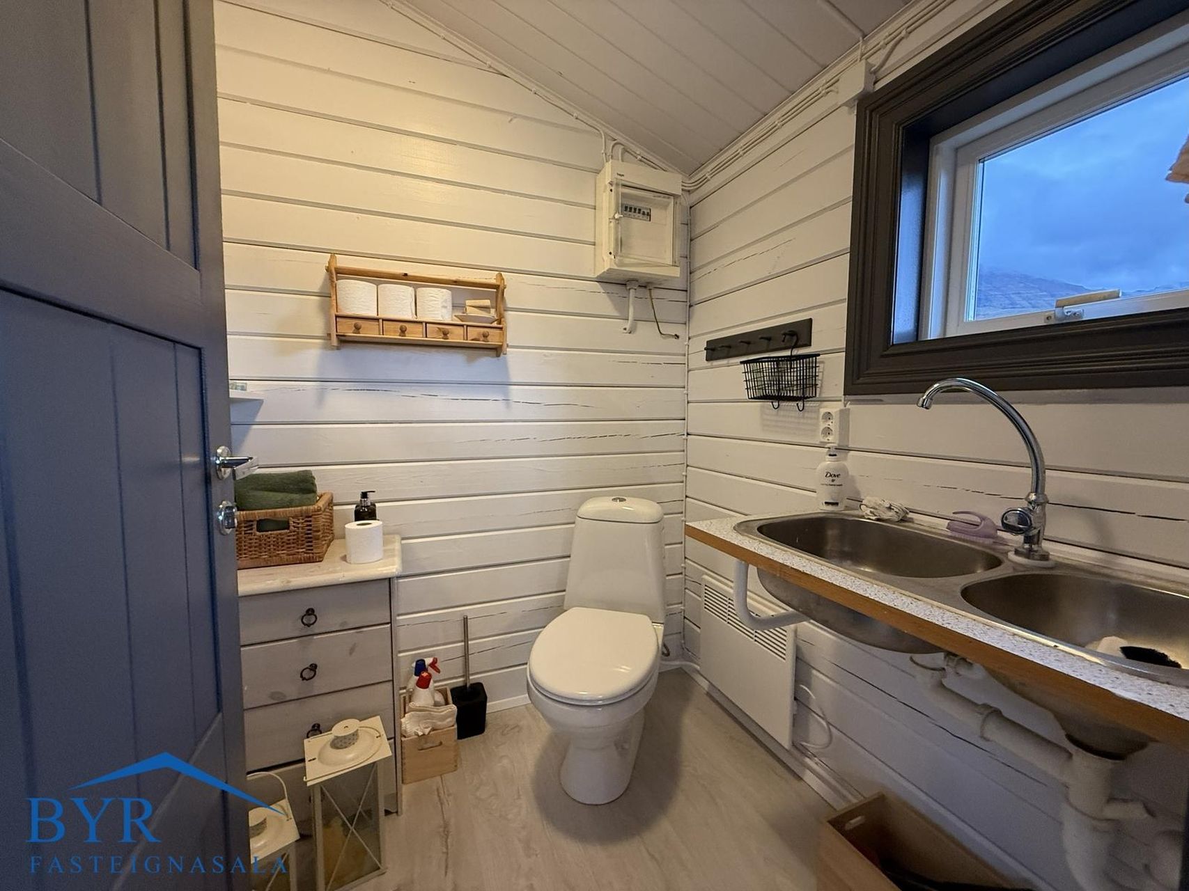 Snyrting, tvöfaldur stálvaskur og salerni, gluggi. Nýlegt flæðandi harðparket er á gólfum. Rafmagnsinntak/tafla og vatnsinntak er á snyrtingu.