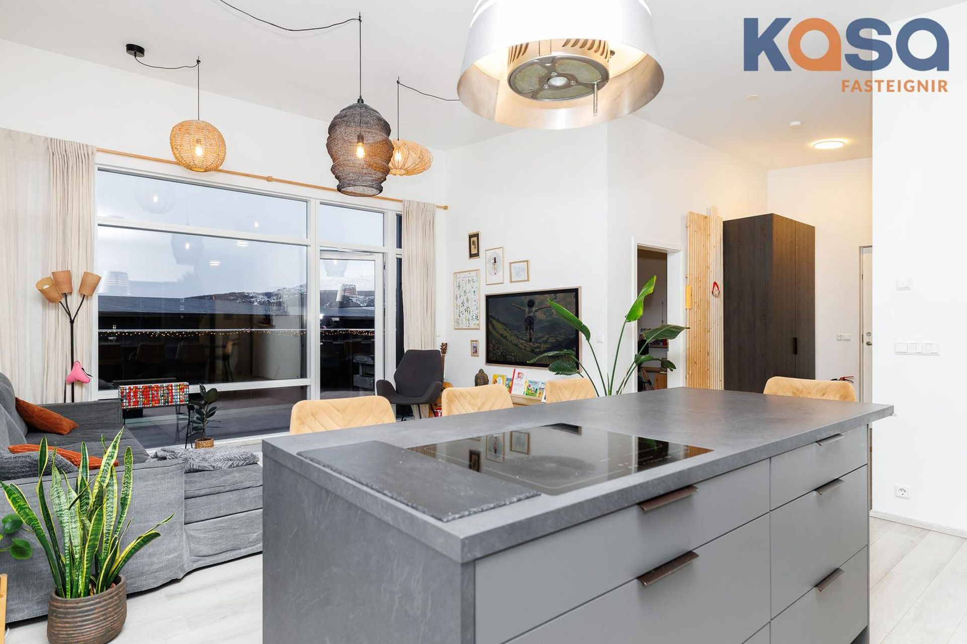 Eldhús og stofa er í opnu og björtu rými með parket á gólfi. Eldhúsinnrétting er glæsileg með innbyggðum ísskáp og uppþvottavél og bakaraofn í vinnuhæð. Eyja er með helluborði og háfur er yfir eyju. Úr stofu er gengið út á um 10 fm svalir með glerhandriði og þaðan er fallegt útsýni.