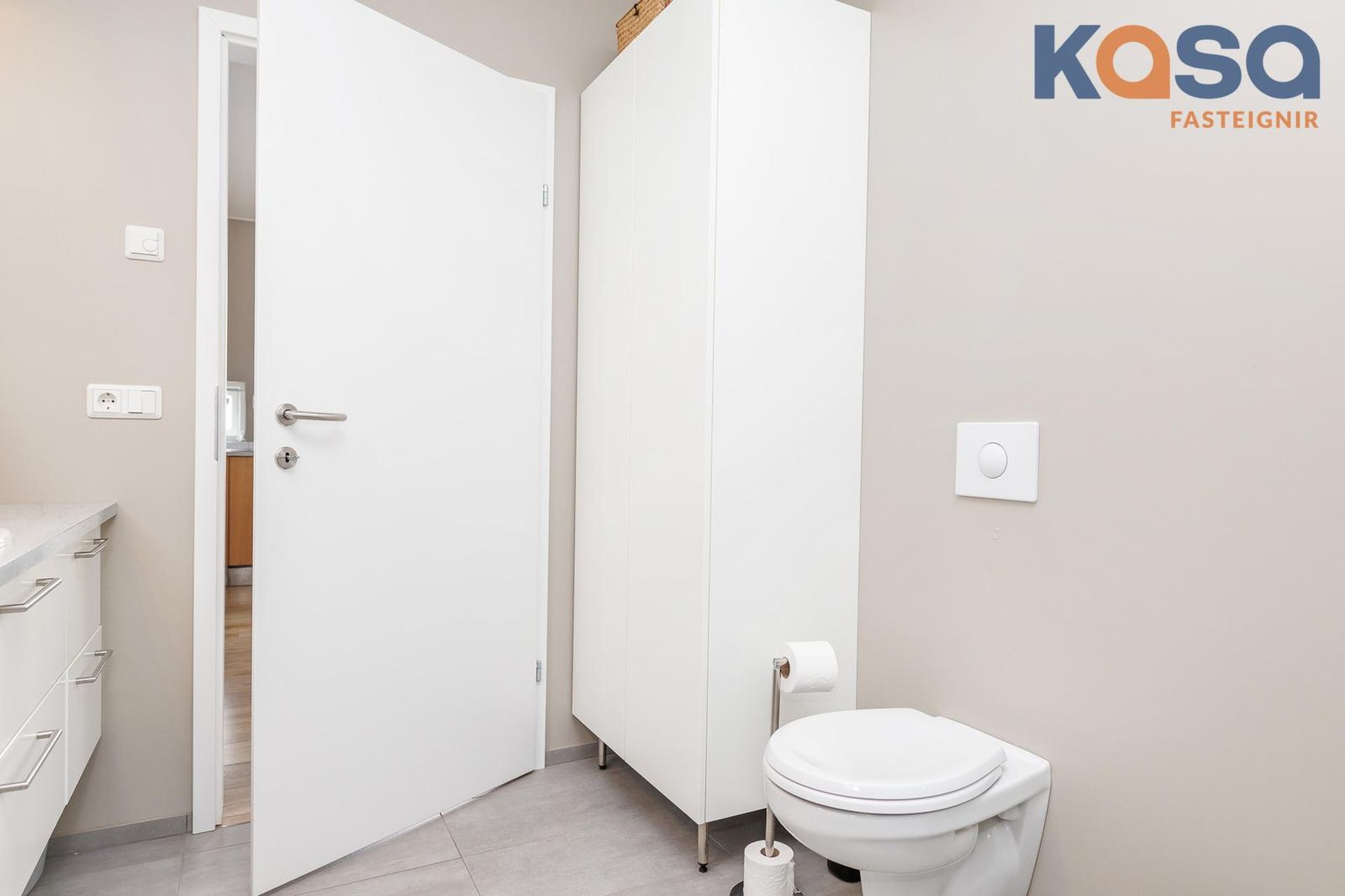 Baðherbergið er flísalagt í gólf og í kringum votrými. Hvít innrétting með plássi fyrir þvottavél og þurrkara ásamt handklæða skáp bak við hurð. Sturtuklefi með glerjum og upphengt salerni.