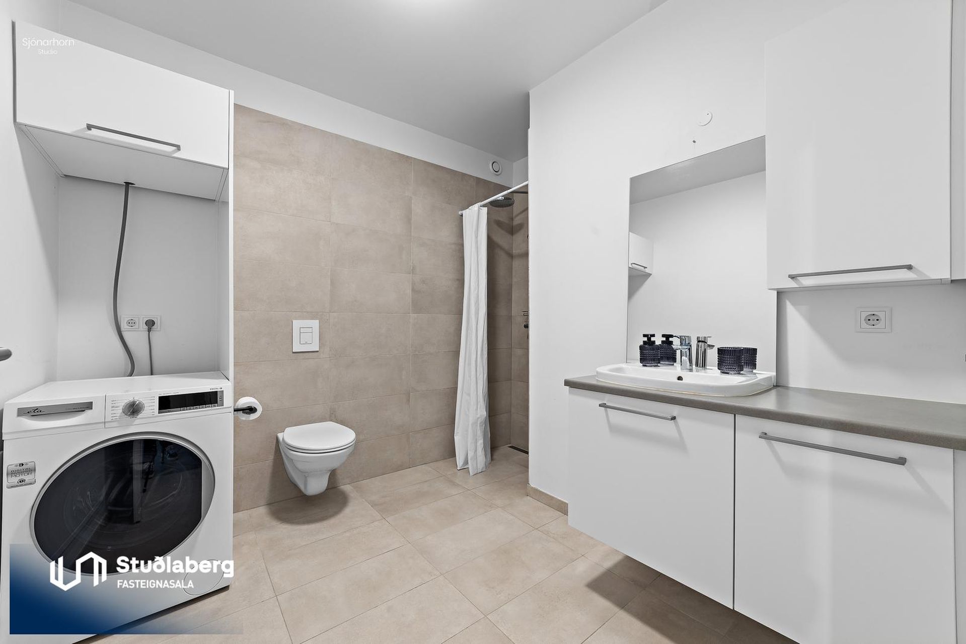 Baðherbergið er flísalagt með hvítri innréttingu, handklæðaofn, steyptri walk-in sturtu og tengi fyrir þvottavél.