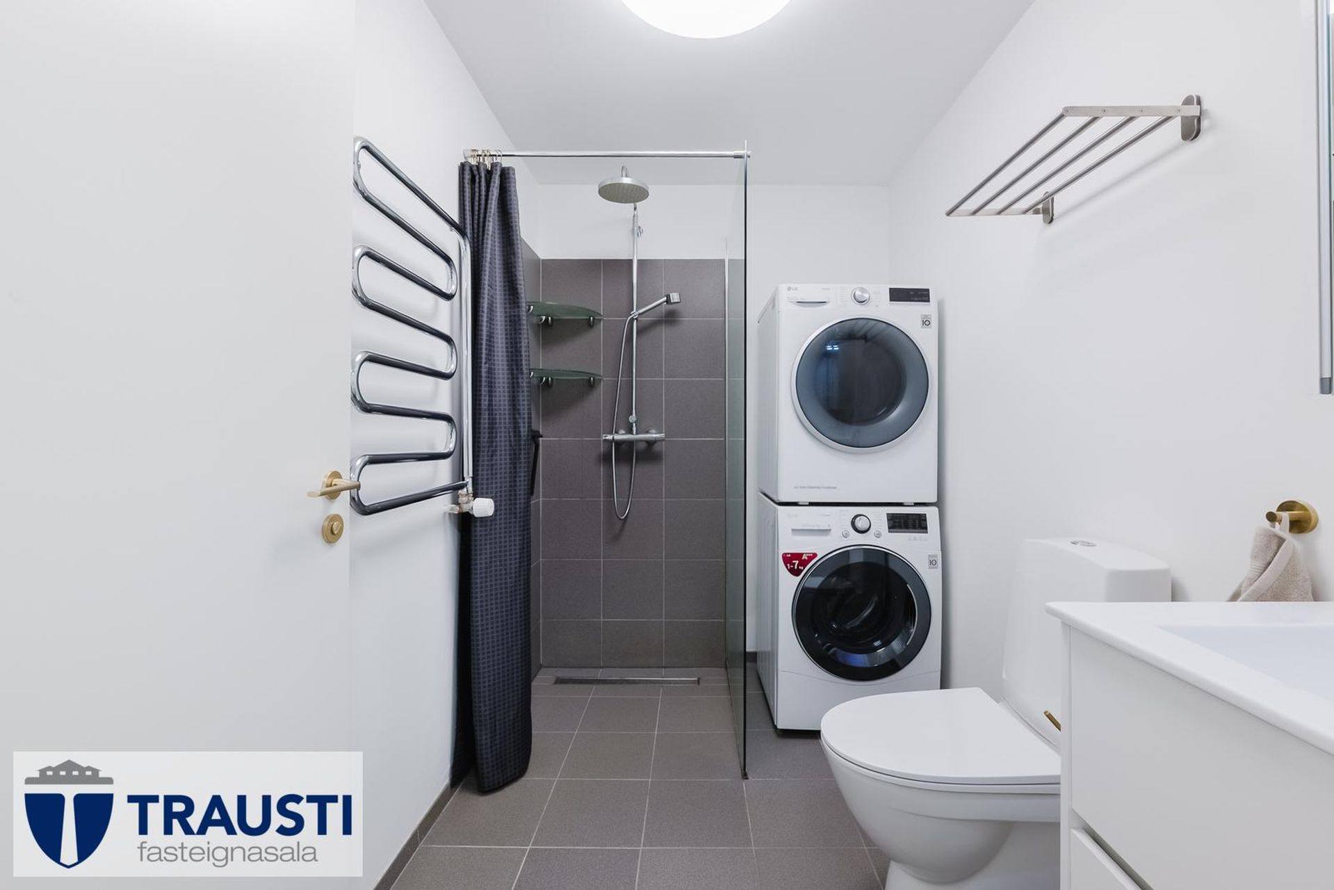 Baðherbergi með innangengri sturtu, nýlegum blöndunartækjum, handklæðaofni, nýlegt salerni, tengi fyrir þvottavél og þurrkara. Flísalagt gólf og veggir.