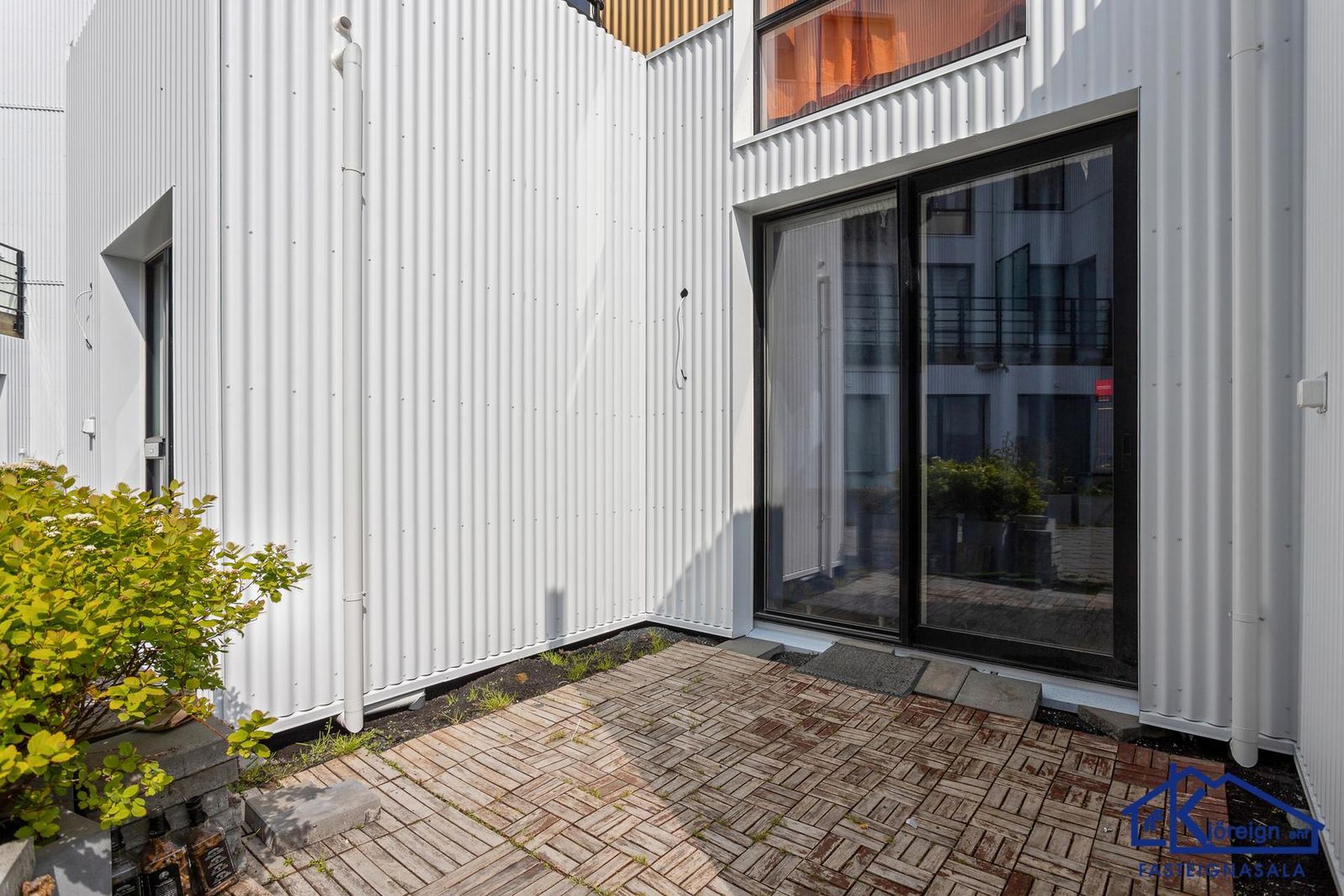 Forstofa er flísalögð með fataskápum. Inn af henni er eldhús með fallegri hvítri innréttingu og parketi á gólfi. Þaðan er útgengt út á sérafnotaflöt sem snýr til suðurs. Stofan er með parketi á gólfi og gólfsíðum gluggum. Baðherbergið er flísalagt með fallegri innréttingu, handklæðaofni og steyptri sturtu með glervegg. Gengið er inn í íbúðina garðmegin. Sér afnotareitur.