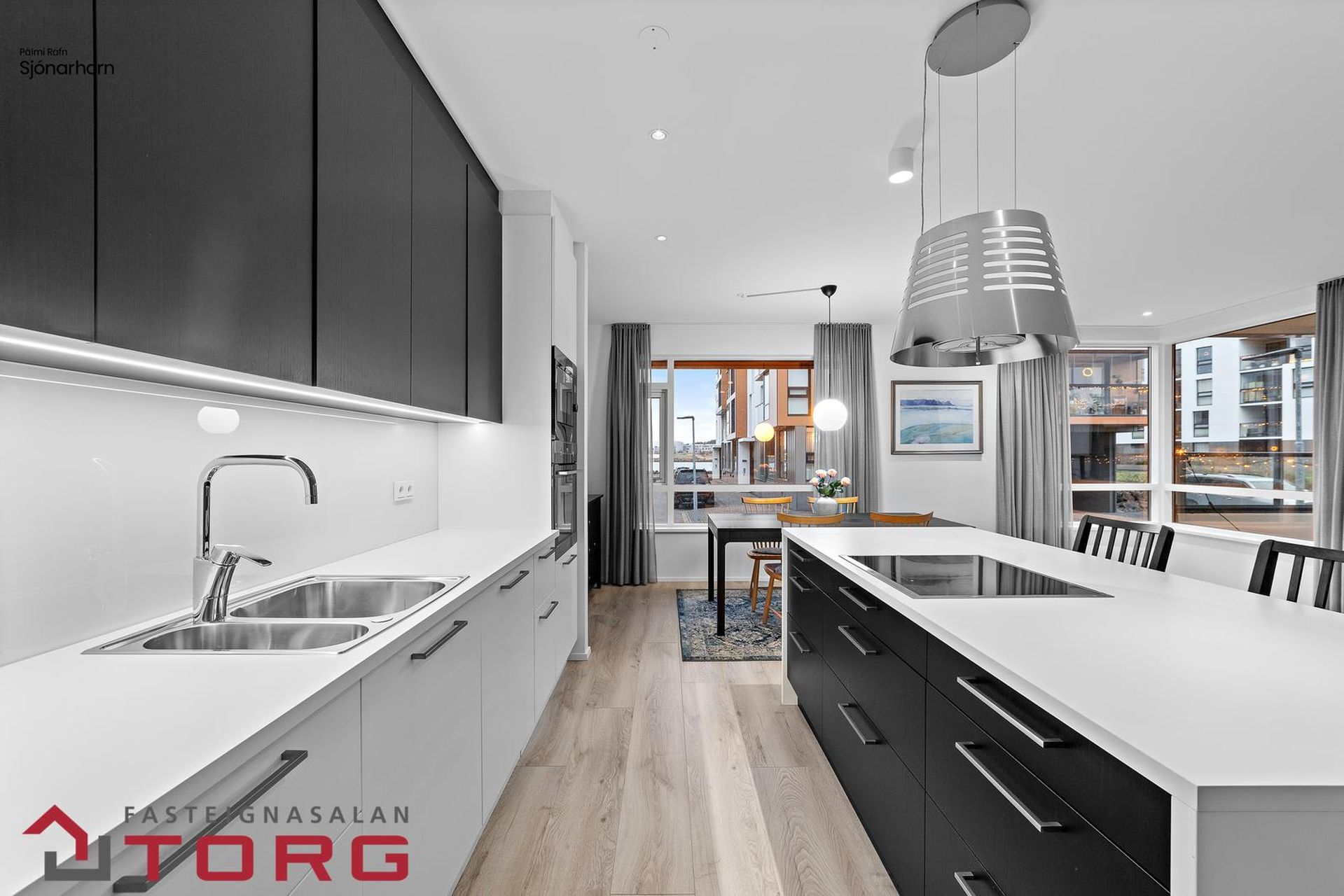 Íbúðin skiptist í, forstofu, hol, hjónaherbergi með fataherbergi, tvö svefnherbergi, baðherbergi, þvottaherbergi, eldhús með eyju, stofu og borðstofu. Allar innréttingar er sérsmíðar af Brúnás, sýnilegar hliðar og hurðir eru sprautulakkaðar, hvítar og svartbæsaður eikarspónn er í eldhúsi. Eldhústækin eru frá AEG og blöndunartæki frá Tengi. Fallegt og vandað parket er á gólfi og flísar á blautrými. Um er að ræða vel skipulagða, rúmgóða og vandaða íbúð með stórum svölum til austurs við sjávarsíðuna á Kársnesinu í Kópavoginum. Fáðu söluyfirlit hér.