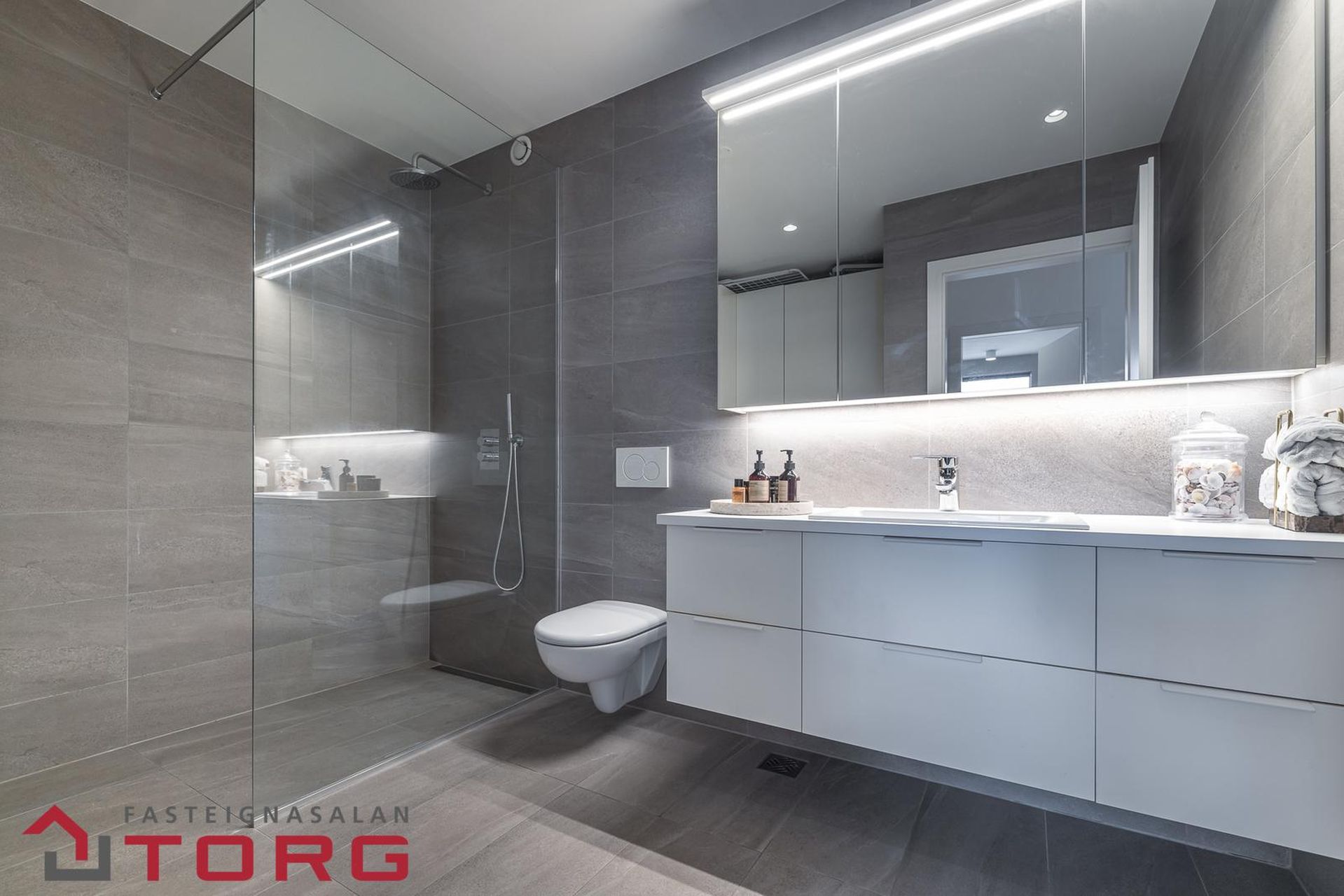 Baðherbergi flísað í hólf og gólf með rúmgóðri sturtu með glerþili, innbyggðum vönduðum blöndunartækjum frá Tengi og fallegri innréttingu frá Brúnás.