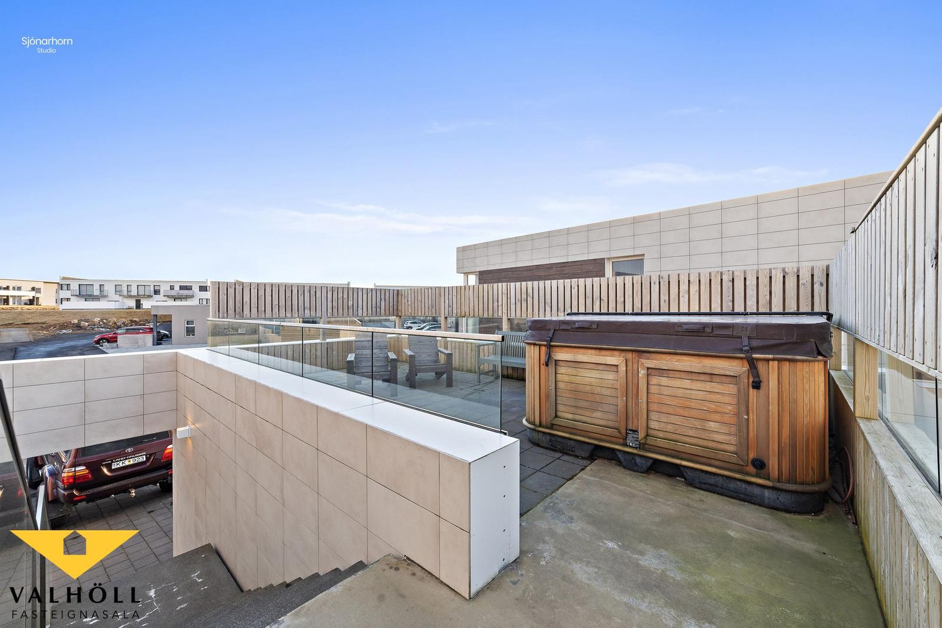 Eigininni fylgja tvö bílastæði hleðslustöð. Tæknirými er fyrir aftan bílskúr neðri hæðar. Aflokaður sólpallur er ofan á bílskúr með heitum pott.