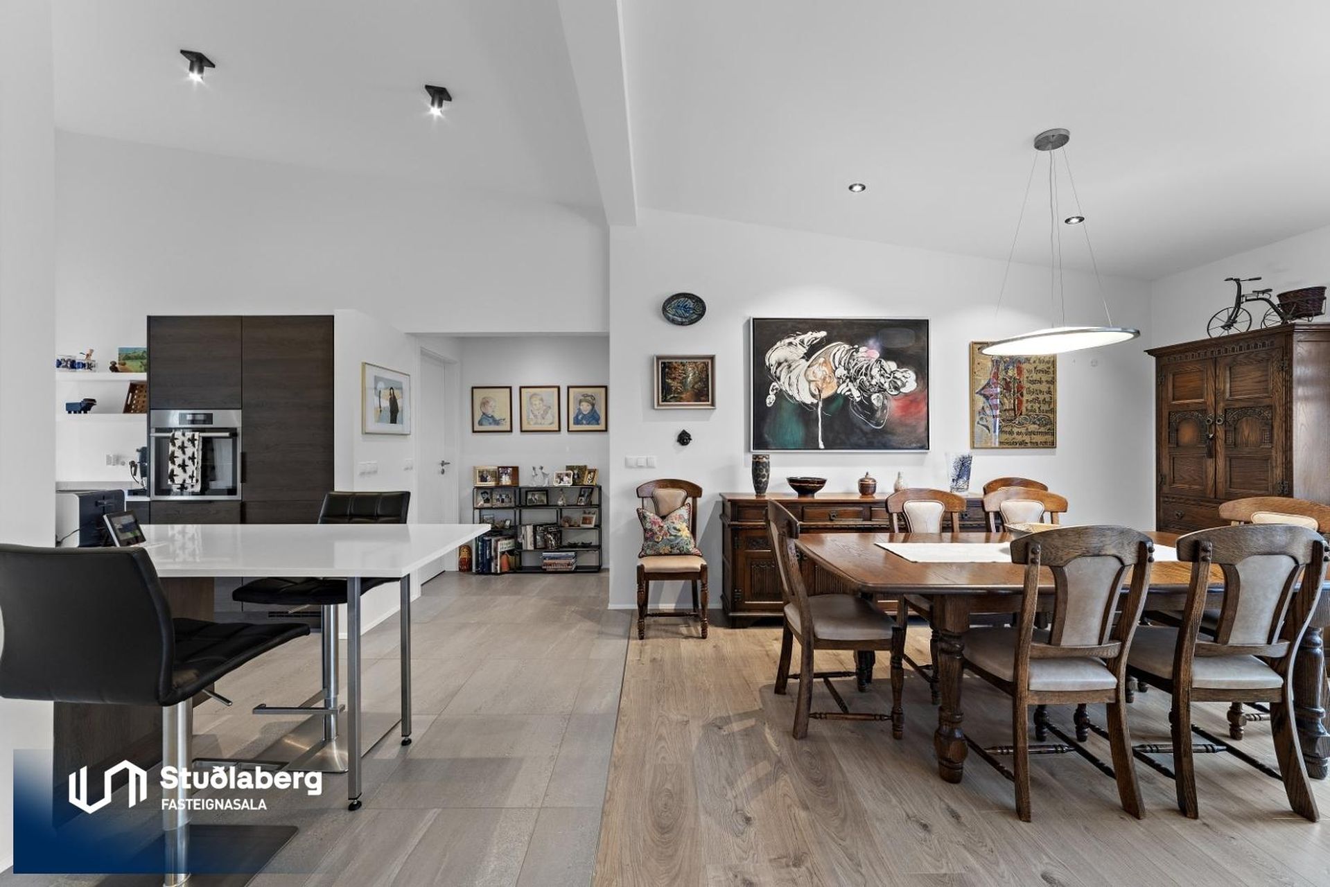 Eldhús: Flísar á gólfi, með sér smíðuðum innréttingum og borðplötu úr Meganite “stein”, dimmanleg lýsing er undir efri skápum. Eldhúsið er með innbyggðum tækjum frá Progress (AEG).