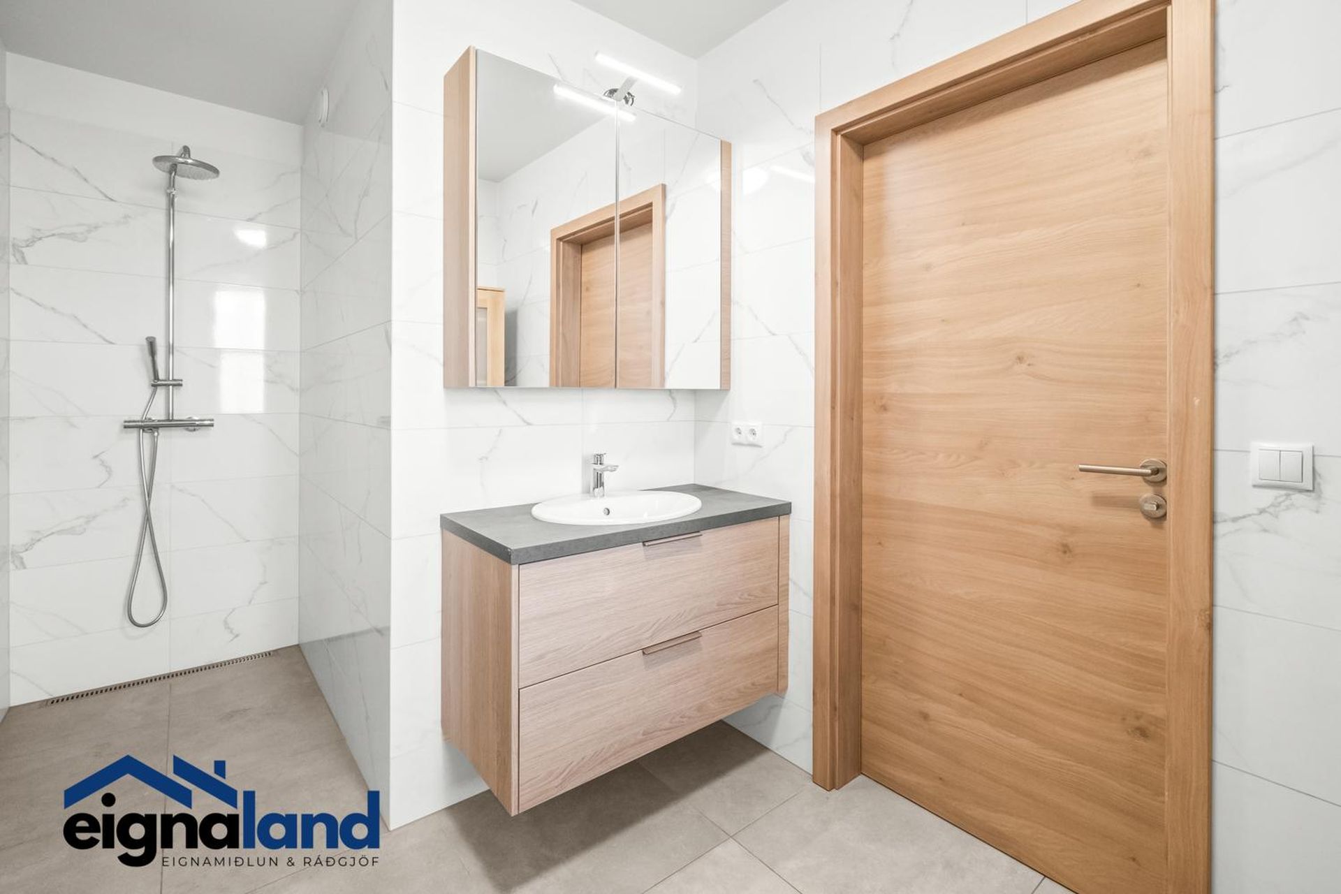 Baðherbergi: Baðherbergi með fallegri eikarinnréttingu. Góð sturta. Flísalagt gólf og veggir.