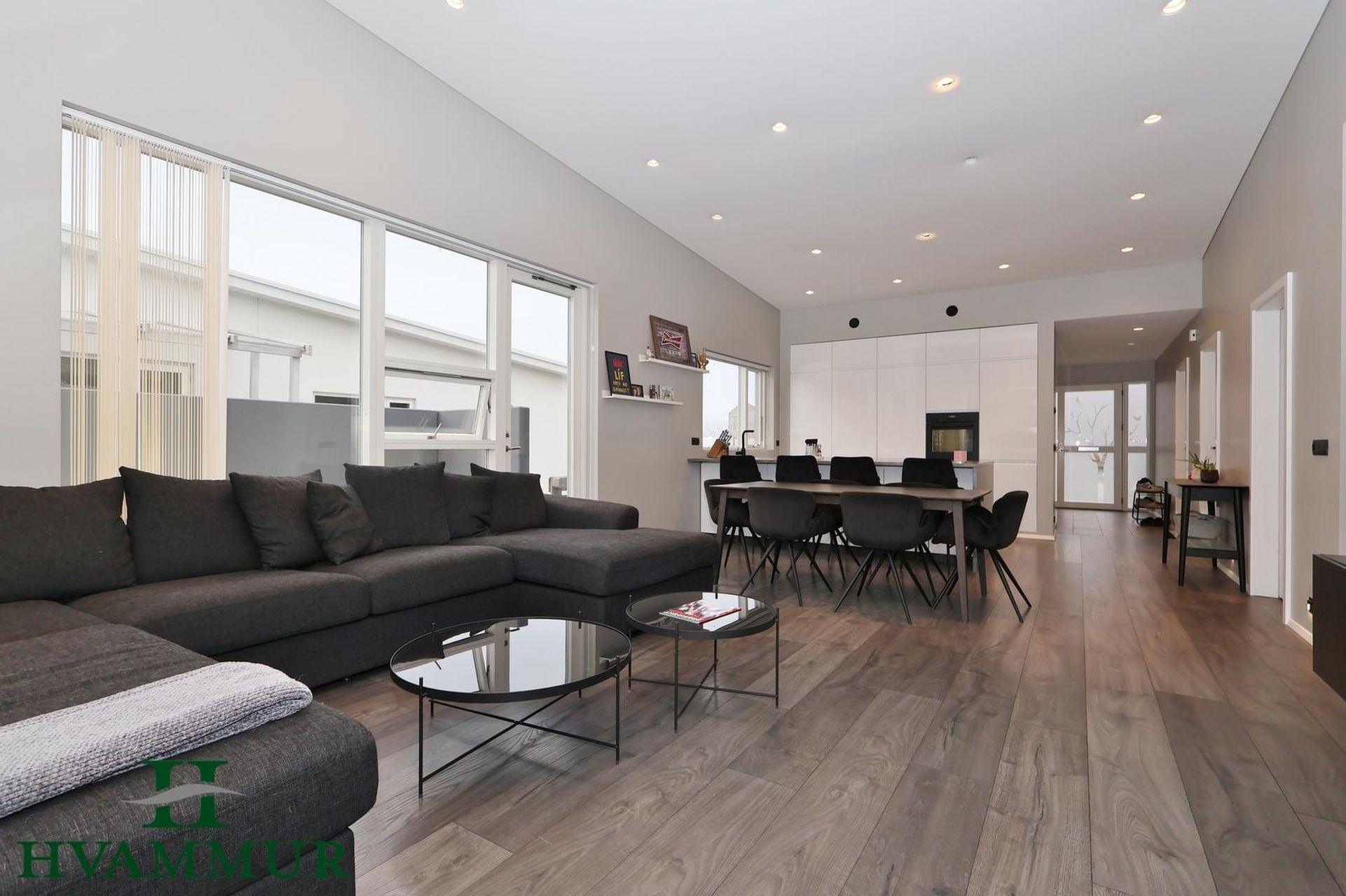 Stofa og eldhús eru í einu opnu og björtu alrými með aukinni lofthæð. Harðparket er á gólfum, dúkur í lofti og innfelld lýsing. Í stofu eru stórir gólfsíðir gluggar bæði til tveggja átta og gönguhurðar út á steypta verönd.