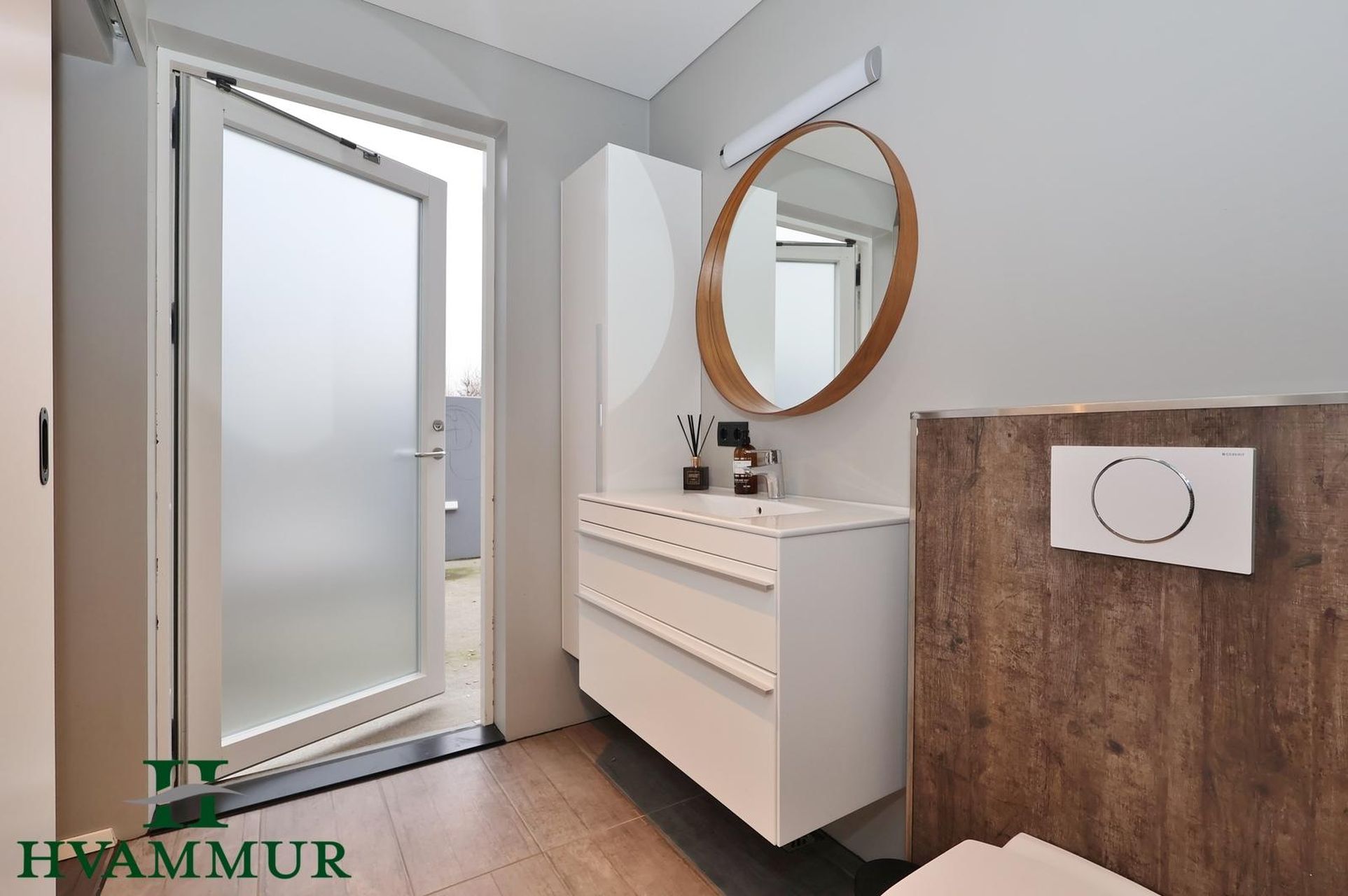 Þvottahús er með harðparketi á gólfi og þar er stór hvít innrétting með bekk og vaska og þar er jafnframt innfelldur frystiskápur í innréttingu sem fylgi með við sölu. Við endann á þvottahúsinu er lítið geymsluloft.
