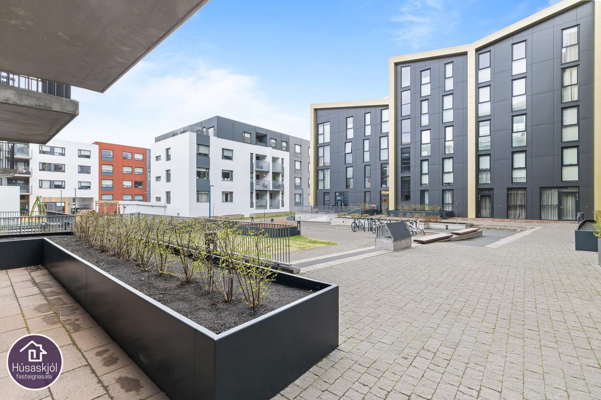 Lýsing eignar: Gengið er inn um sameiginlegan inngang og komið í alrými sem er eldhús og stofa. Eldhúsinnrétting á einum vegg með efri og neðri skápum og harðparket á gólfi, útgengt á sérafnotarétt sem snýr inn í garðinn. Gangur með fataskápum. Hjónaherbergi er með fataskápum og harðparketi. Baðherbergi er flísalagt í hólf og gólf, tengi fyrir þvottavél og þurrkara, sturtuklefi, handklæðaofn, innrétting og upphengt salerni.