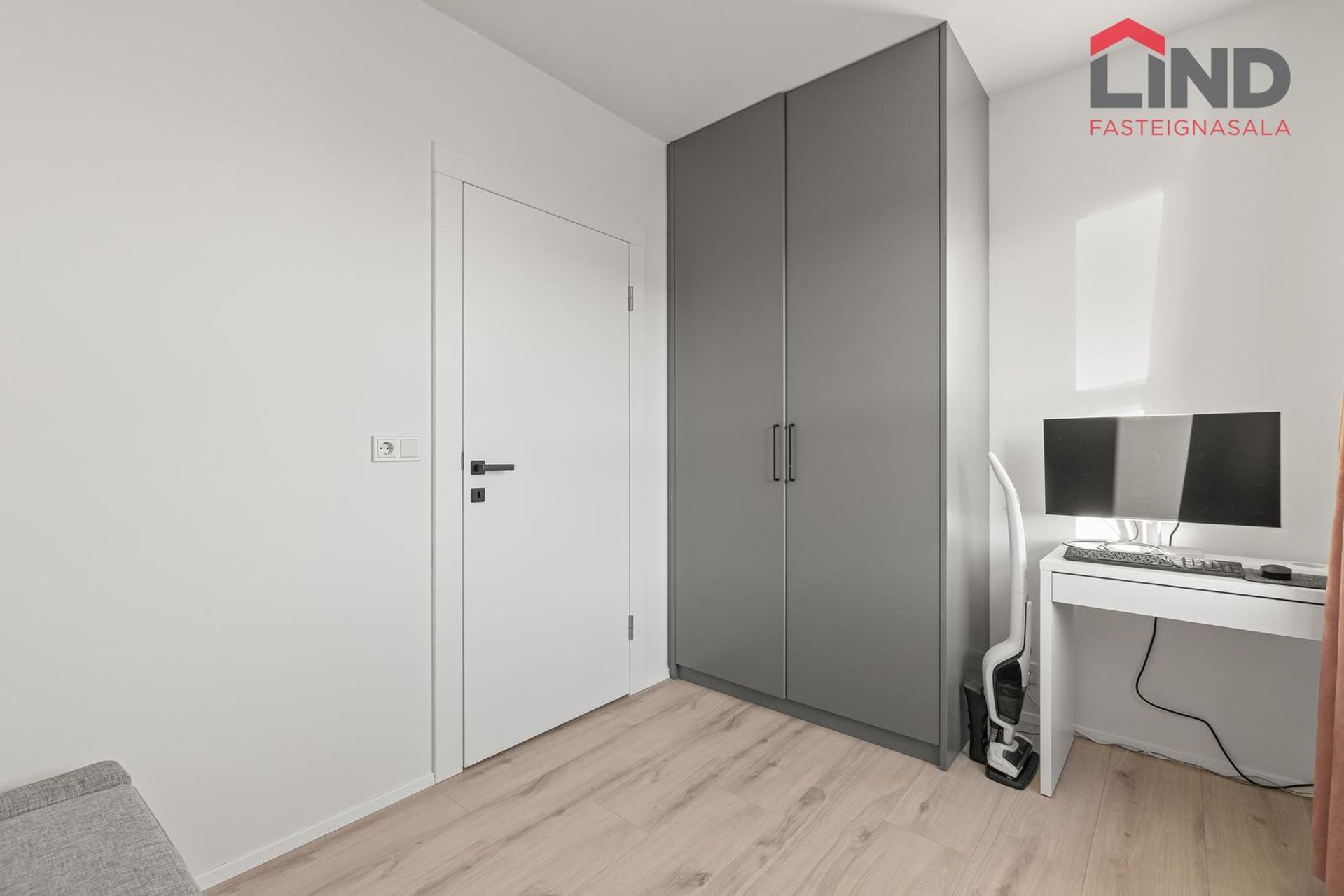 Svefnherbergi I: Með harðparketi á gólfi, skápum og glugga til austurs.